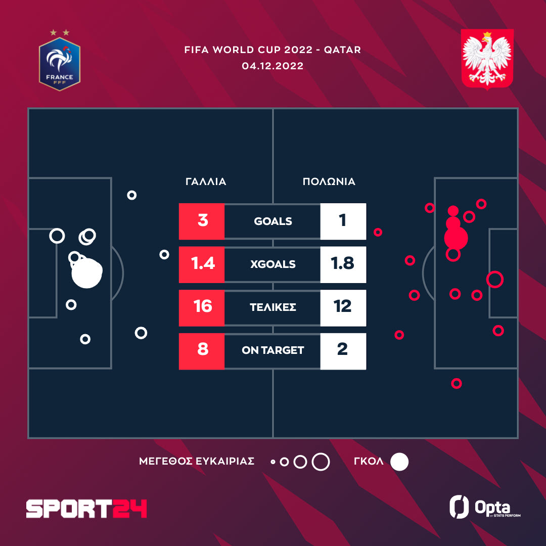Η παγκόσμια πρωταθλήτρια είναι εδώ και σε δαιμονιώδη κατάσταση! Η Πολωνία πραγματοποίησε αρκετά καλή εμφάνιση, την καλύτερη ως τώρα για εκείνη στα γήπεδα του Κατάρ, όμως δεν ήταν επαρκής για να σταματήσει την Γαλλία, με τους μπλε του Ντιντιέ Ντεσάμπ να είναι απολαυστικοί και να θριαμβεύουν με 3-1, για να πάρουν πανάξια το εισιτήριο για τους 8 του Μουντιάλ.
