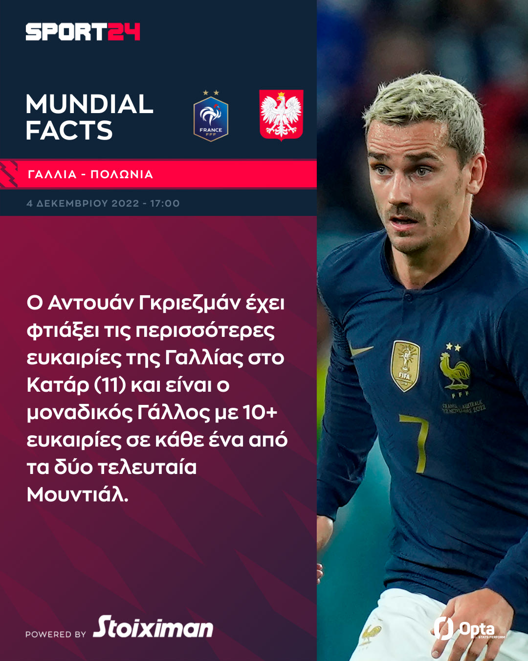 Ο Αντουάν Γκριεζμάν έχει φτιάξει τις περισσότερες ευκαιρίες της Γαλλίας στο Κατάρ (11) και είναι ο μοναδικός Γάλλος με 10+ ευκαιρίες σε κάθε ένα από τα δύο τελευταία Μουντιάλ.