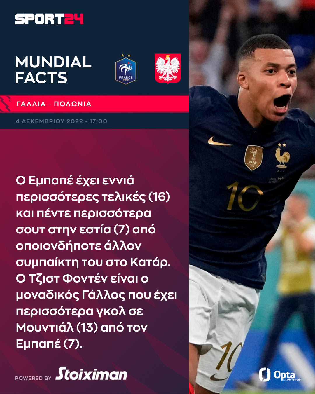 Γαλλία και Πολωνία αναμετρώνται στο Al Thumama Stadium με φόντο ένα εισιτήριο στους "8" του Μουντιάλ 2022. Ας δούμε μερικά χρήσιμα facts της συνάντησης.