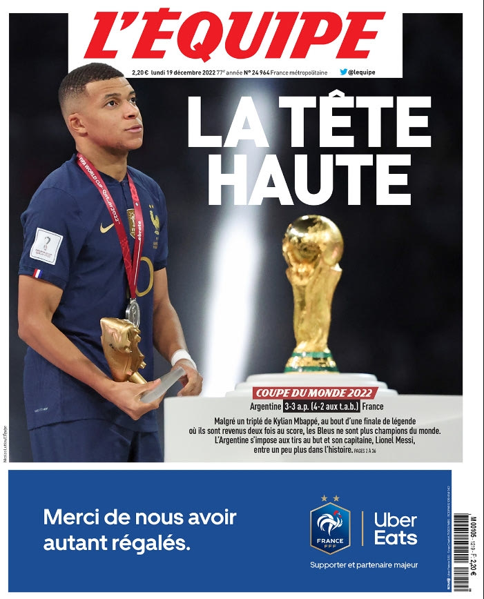 Η Equipe αφιέρωσε το εξώφυλλο της Δευτέρας στον... Κιλιάν Εμπαπέ δίπλα στο τρόπαιο του Μουντιάλ 2022, έπειτα από την ήττα της Γαλλίας από την Αργεντινή στον τελικό.