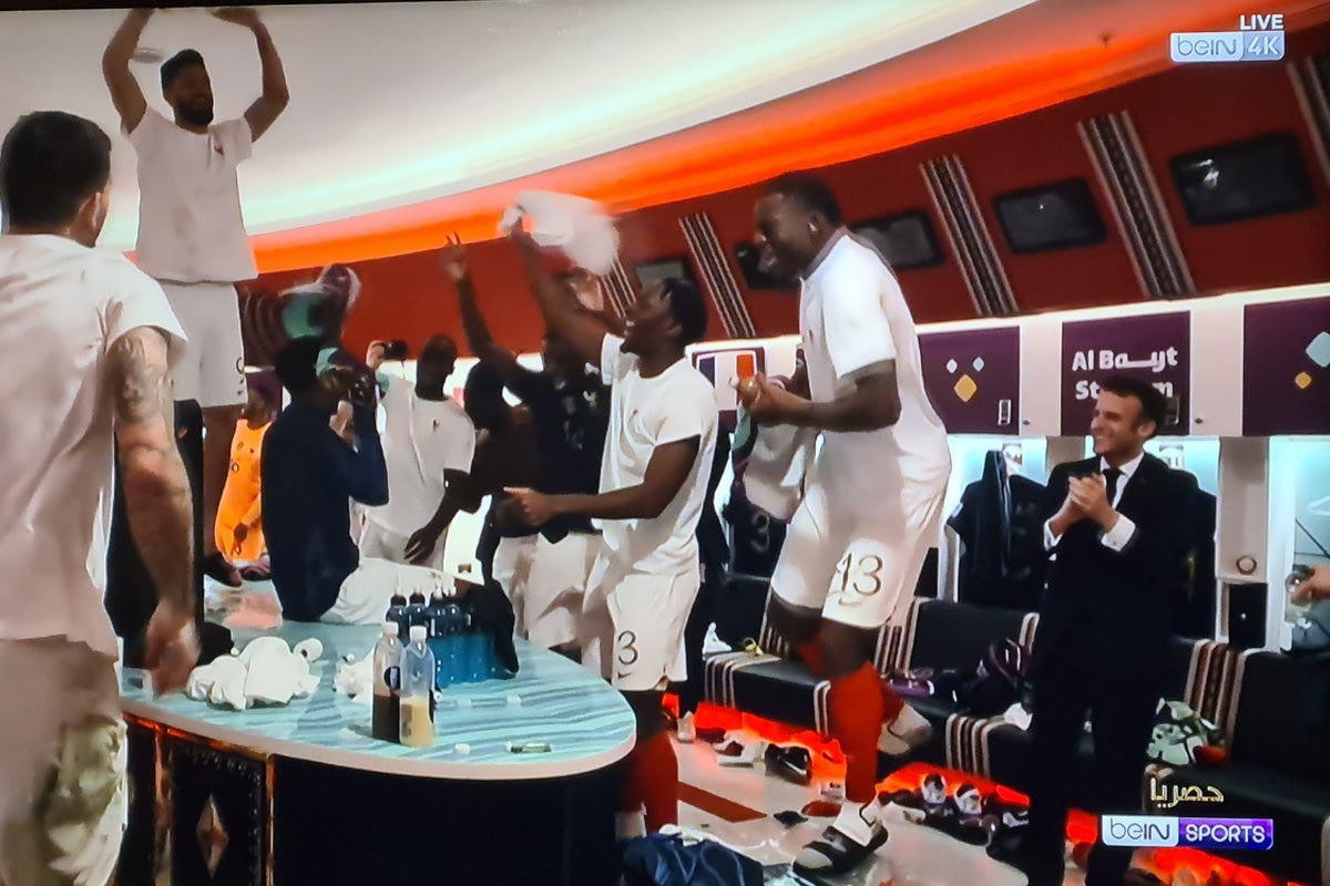 Οι Γάλλοι διεθνείς έστησαν πάρτι στα αποδυτήρια του “Αλ Μπαΐτ” έπειτα από το τέλος του αγώνα, με… προσκεκλημένο τον πρόεδρο της χώρας.