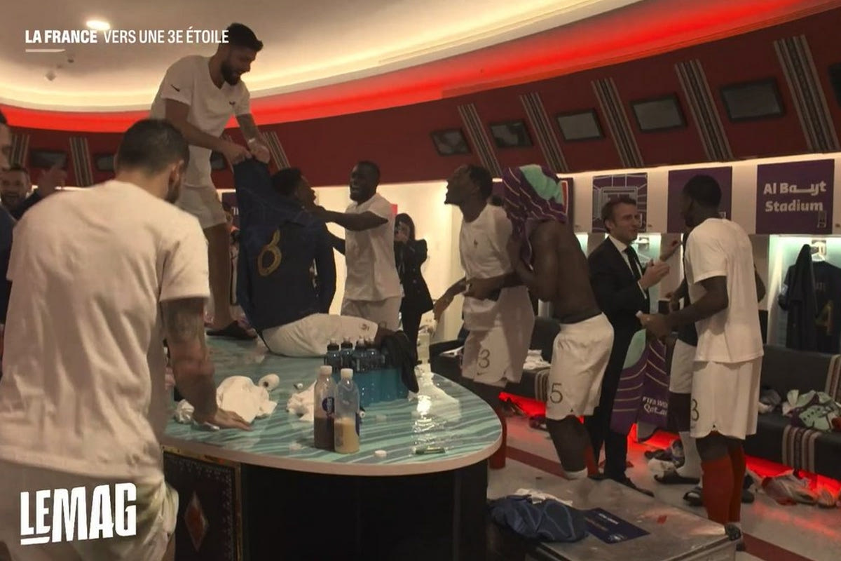 Η Γαλλία προκρίθηκε στον τελικό του Μουντιάλ του 2022 και οι ποδοσφαιριστές της το γλέντησαν με την ψυχή τους στα αποδυτήρια, παρουσία του προέδρου της χώρας, Εμανουέλ Μακρόν.