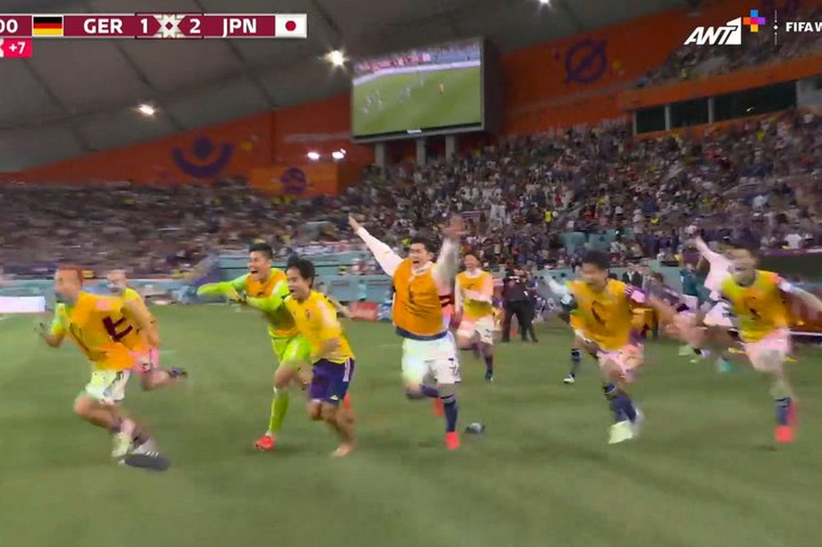 Με το τελευταίο σφύριγμα του διαιτητή οι αναπληρωματικοί της Ιαπωνίας μπούκαραν με εκπληκτικό σπριντ στο γήπεδο για να πανηγυρίσουν τη μεγάλη ανατροπή της ομάδας τους με τη Γερμανία.