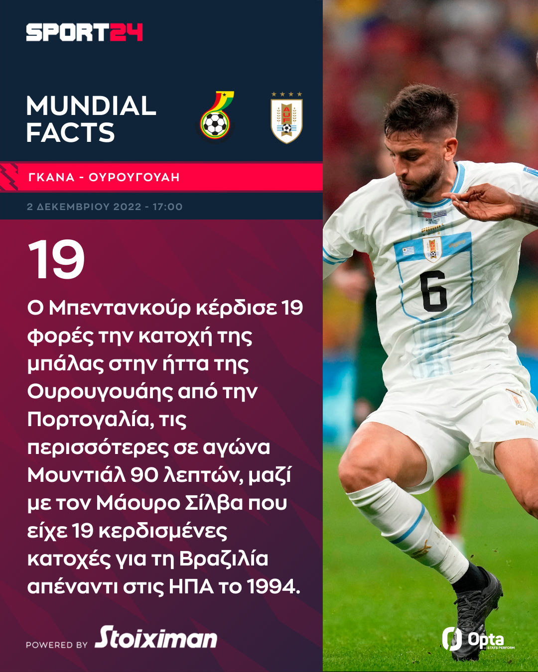 Η Ουρουγουάη δεν έχει γκολ στο Κατάρ, παρά τις 21 τελικές που έχει κάνει. Η τελευταία ομάδα από τη Νότια Αμερική που δεν σκόραρε σε φάση ομίλων ήταν το Περού το 1978.