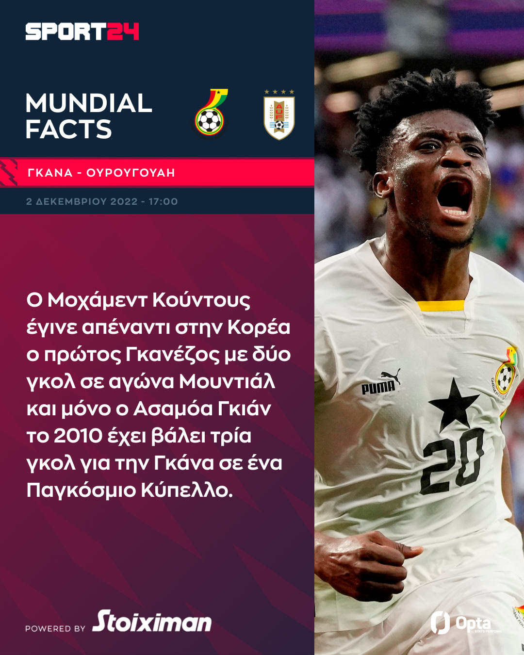 Η Γκάνα αντιμετωπίζει την Ουρουγουάη (17.00, ΑΝΤ1, LIVE SPORT24) διασταυρώνουν τα ξίφη τους σ’ ένα κρίσιμο παιχνίδι για τον όγδοο όμιλο του Παγκοσμίου Κυπέλλου.