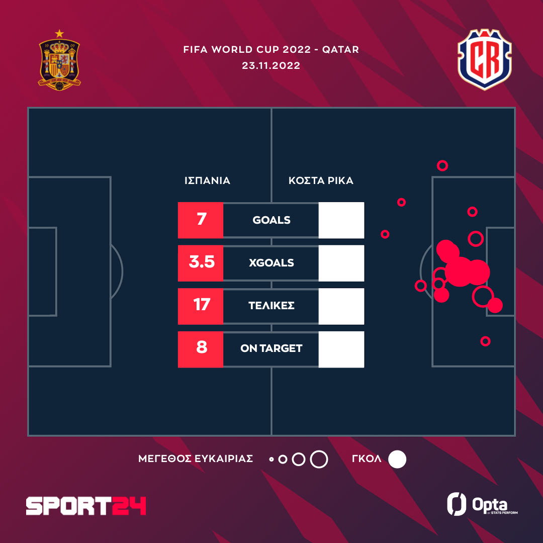 Η Ισπανία συνέντριψε με "επτάρα" την Κόστα Ρίκα στην πρεμιέρα του Μουντιάλ 2022 και την ίδια στιγμή δεν την άφησε να κάνει ούτε μια τελική προσπάθεια, κάτι που συνέβη για δεύτερη φορά στην ιστορία των Παγκοσμίων Κυπέλλων.
