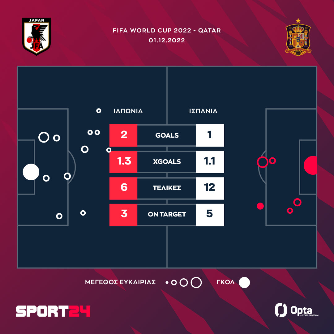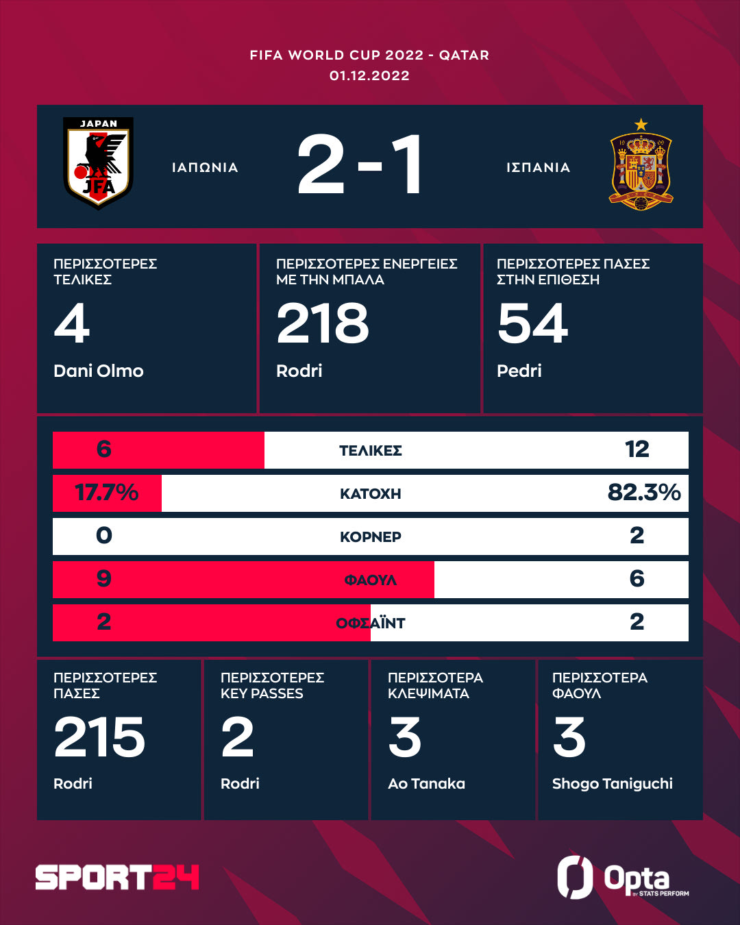 Η Ιαπωνία έκανε τη δεύτερη ανατροπή απέναντι σε μεγαθήριο και με τη νίκη 2-1 επί της Ισπανίας πήρε την πρωτιά του 5ου ομίλου του Μουντιάλ 2022, αφήνοντας δεύτερη την ομάδα του Λουίς Ενρίκε και εκτός συνέχειας για δεύτερη σερί διοργάνωση τη Γερμανία.