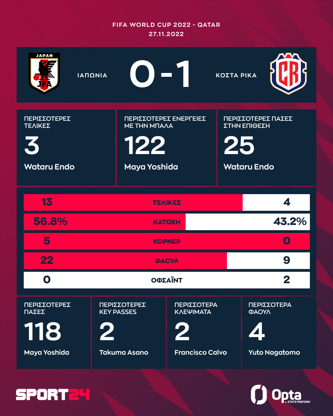 Αποτέλεσμα; Οι μπλε σαμουράι ναι μεν εμφάνισαν καλύτερη εικόνα στο μεγαλύτερο κομμάτι του αγώνα, ειδικά στο δεύτερο μέρος, όμως απέτυχαν να δημιουργήσουν πολλές καθαρές ευκαιρίες μπροστά στα καρέ του Κέιλορ Νάβας και το πλήρωσαν με πολύ σκληρά, με τους Κοσταρικανούς να βρίσκουν τη μία στιγμή που έψαχναν σε όλο το παιχνίδι και να την εκμεταλλεύονται όταν ο Φούλερ νίκησε με δυνατό σουτ τον Γκόντα στο 81ο λεπτό.