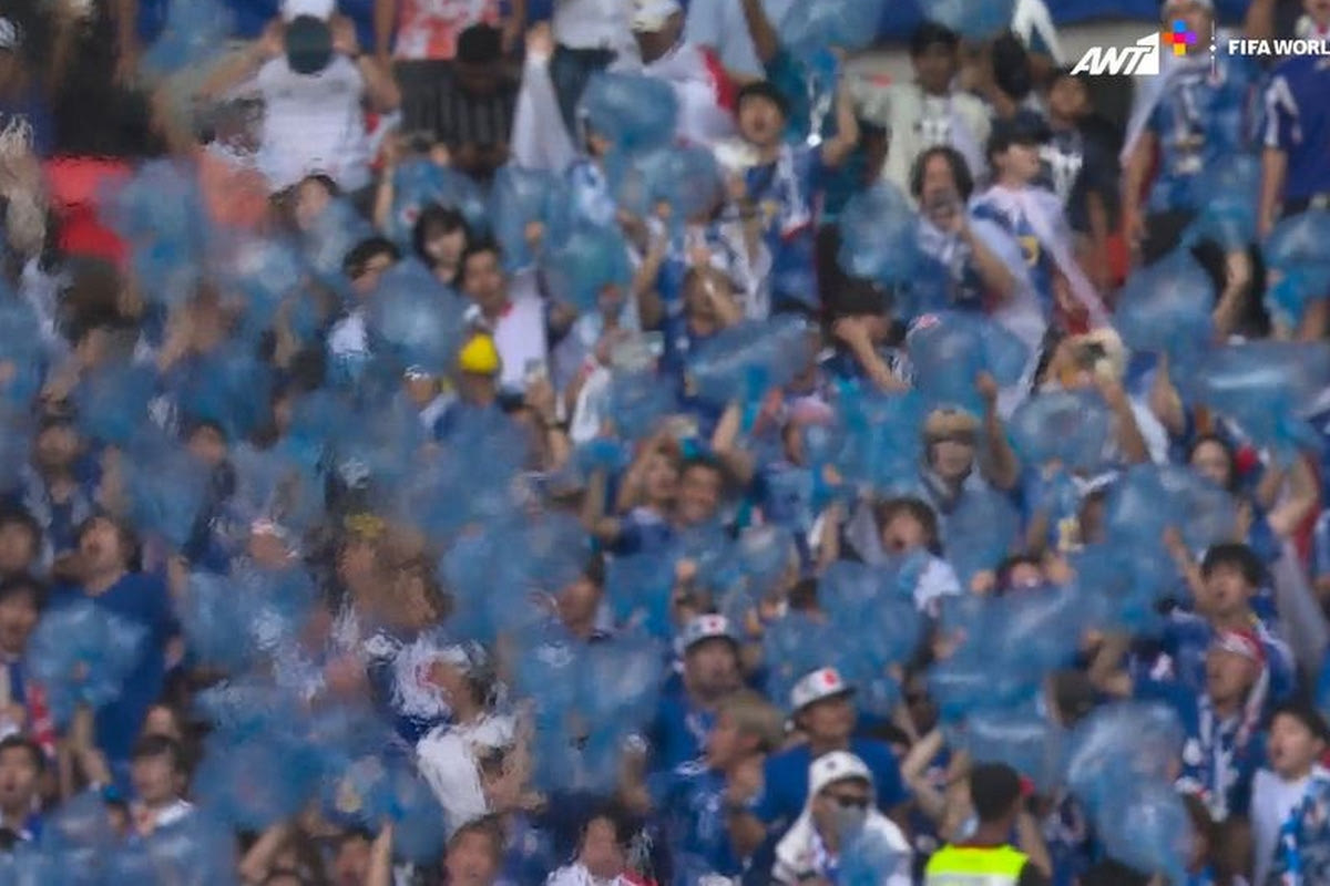 Ο τηλεοπτικός φακός απαθανάτισε Ιάπωνες οπαδούς να πανηγυρίζουν και να εμψυχώνουν την ομάδα τους κρατώντας σακούλες στα χέρια.