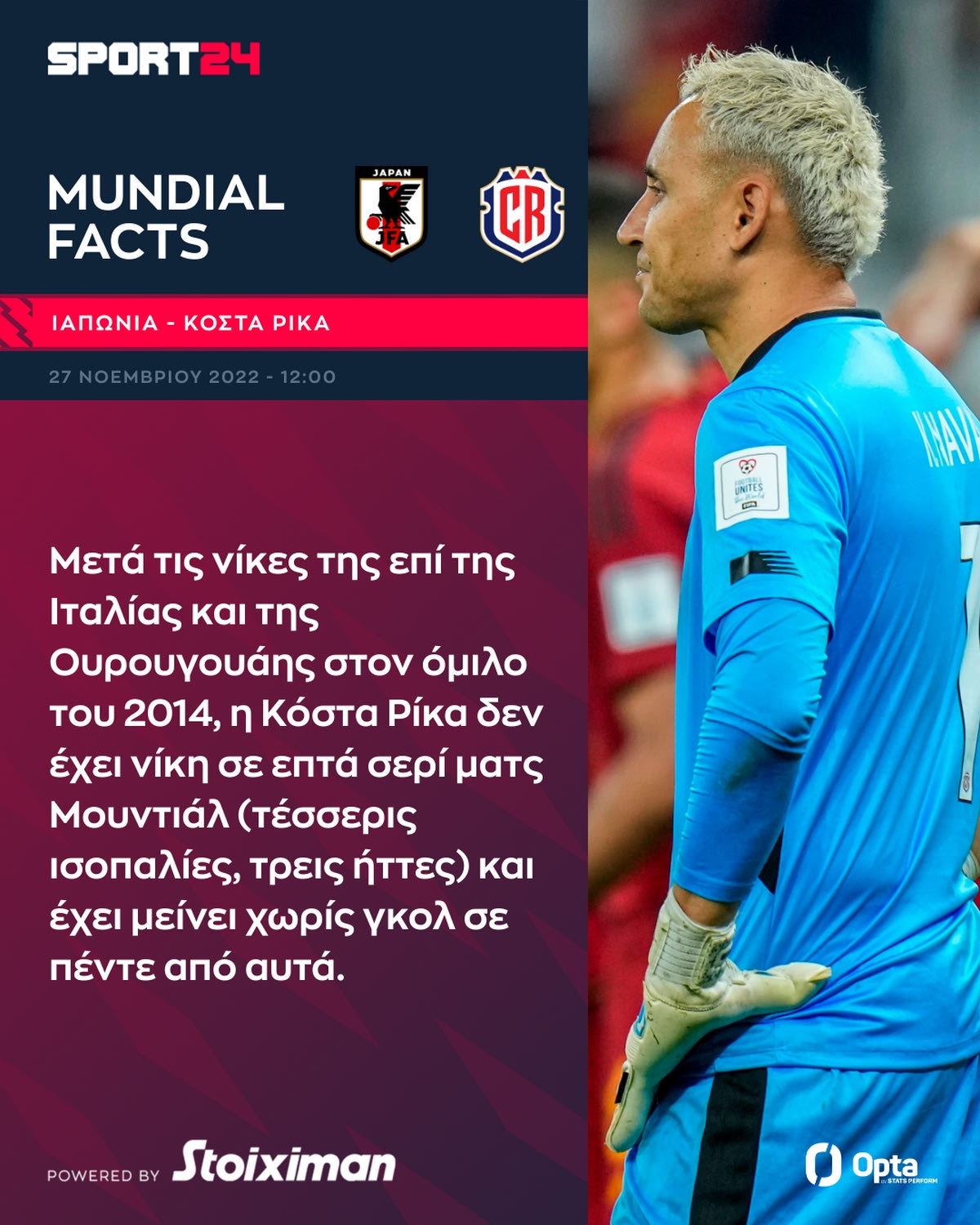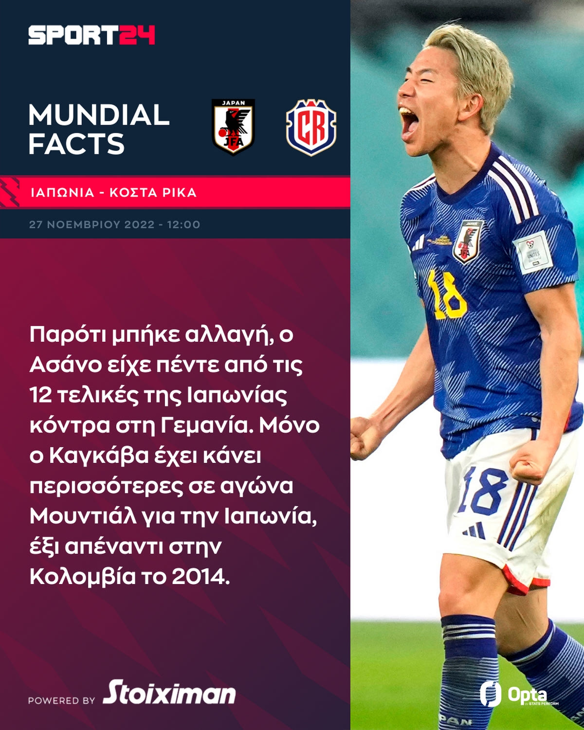 Η Ιαπωνία αντιμετωπίζει την Κόστα Ρίκα (27/11, 12:00, ΑΝΤ1, ΑΝΤ1+, LIVE SPORT24) σ' ένα πολύ σημαντικό παιχνίδι για τον πέμπτο όμιλο του Παγκοσμίου Κυπέλλου. Δείτε χρήσιμα facts για την αναμέτρηση.