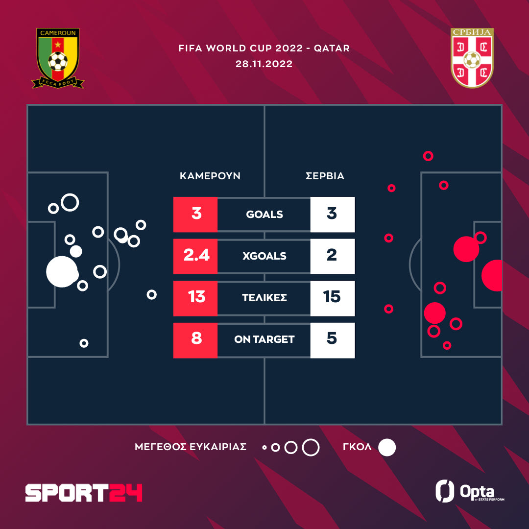 Το Καμερούν είχε και νέα μεγάλη ευκαιρία για δεύτερο γκολ, με τον Κούντε να μην μπορεί να νικήσει στο 43′ τον τερματοφύλακα της Σερβίας. Μέσα σε δύο λεπτά το ματς ήρθε “τούμπα”. Στο 45+1′ Ο Τάντιτς εκτέλεσε φάουλ, ο Πάβλοβιτς σηκώθηκε με τον Ανγκισά να τον έχει χάσει και με κεφαλιά έστειλε την μπάλα στα δίχτυα.