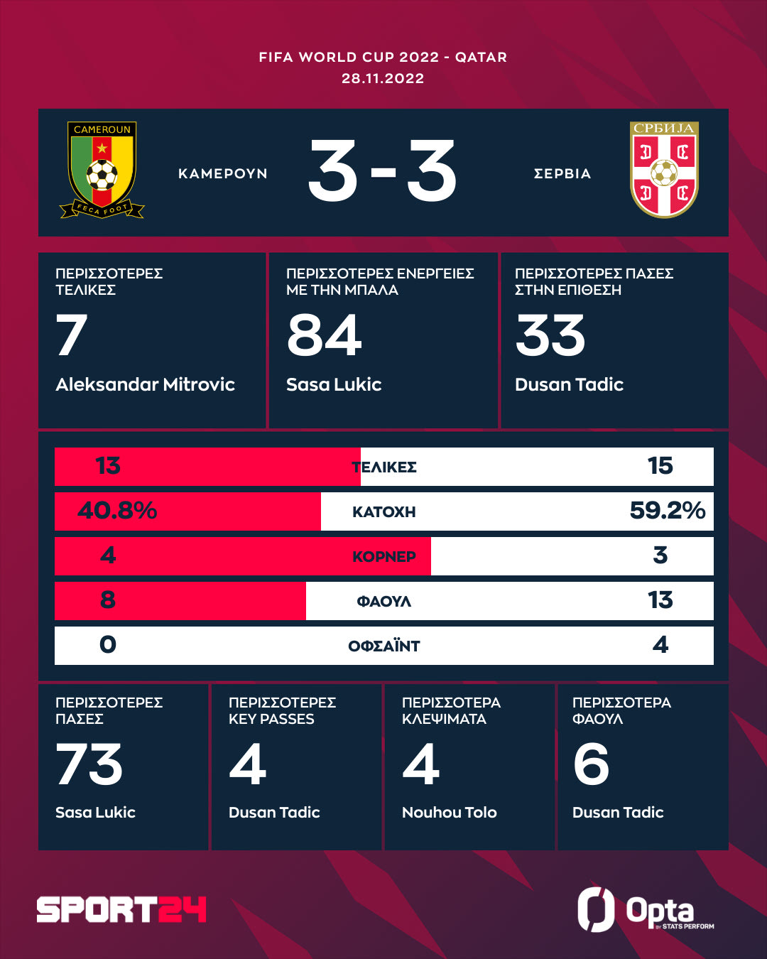 Ματσάρα έγινε στο Al Janoub Stadium με την αναμέτρηση ανάμεσα στο Καμερούν και τη Σερβία να λήγει 3-3. Η ομάδα του Στόικοβιτς έκανε προσωρινά την ανατροπή μετά το 1-0 των Αφρικανών και έφτασε στο 3-1. Ωστόσο, οι Καμερουνέζοι με δύο γκολ επέστρεψαν και έμειναν ζωντανοί. Δύο ασίστ από τον Ζίβκοβιτς.