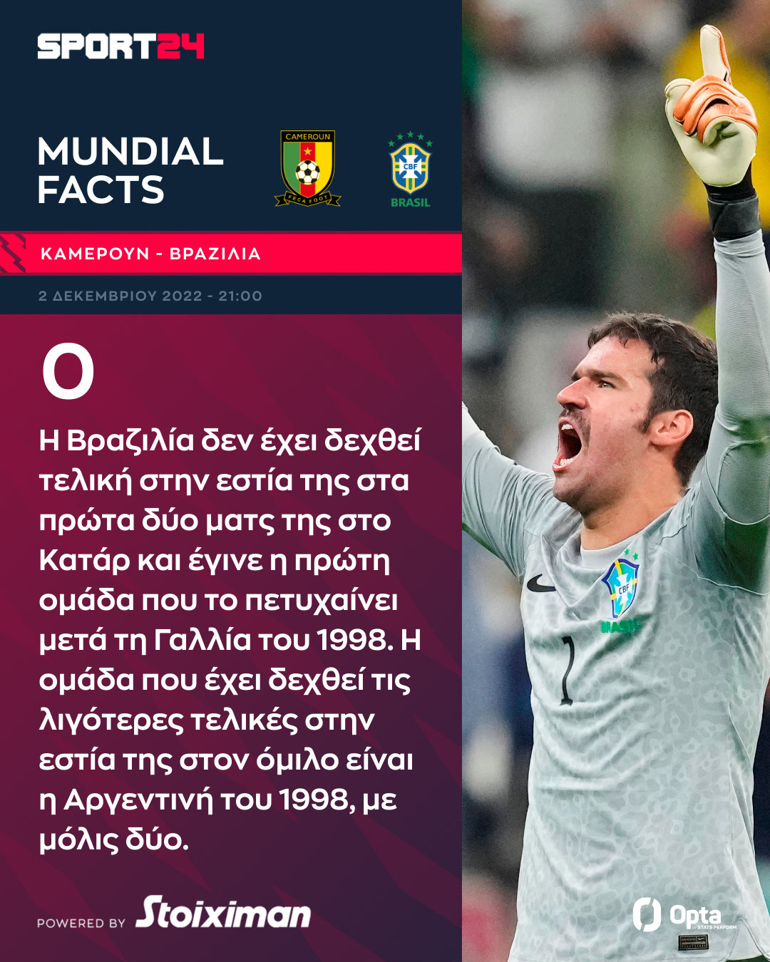 Η Βραζιλία θέλει να εξασφαλίσει την πρωτιά στον όμιλό της στο Μουντιάλ 2022, κόντρα στο Καμερούν (02/12, 21:00, ΑΝΤ1 και Live SPORT24) που θέλει μόνο νίκη για να έχει ελπίδες πρόκρισης στα νοκ-άουτ.