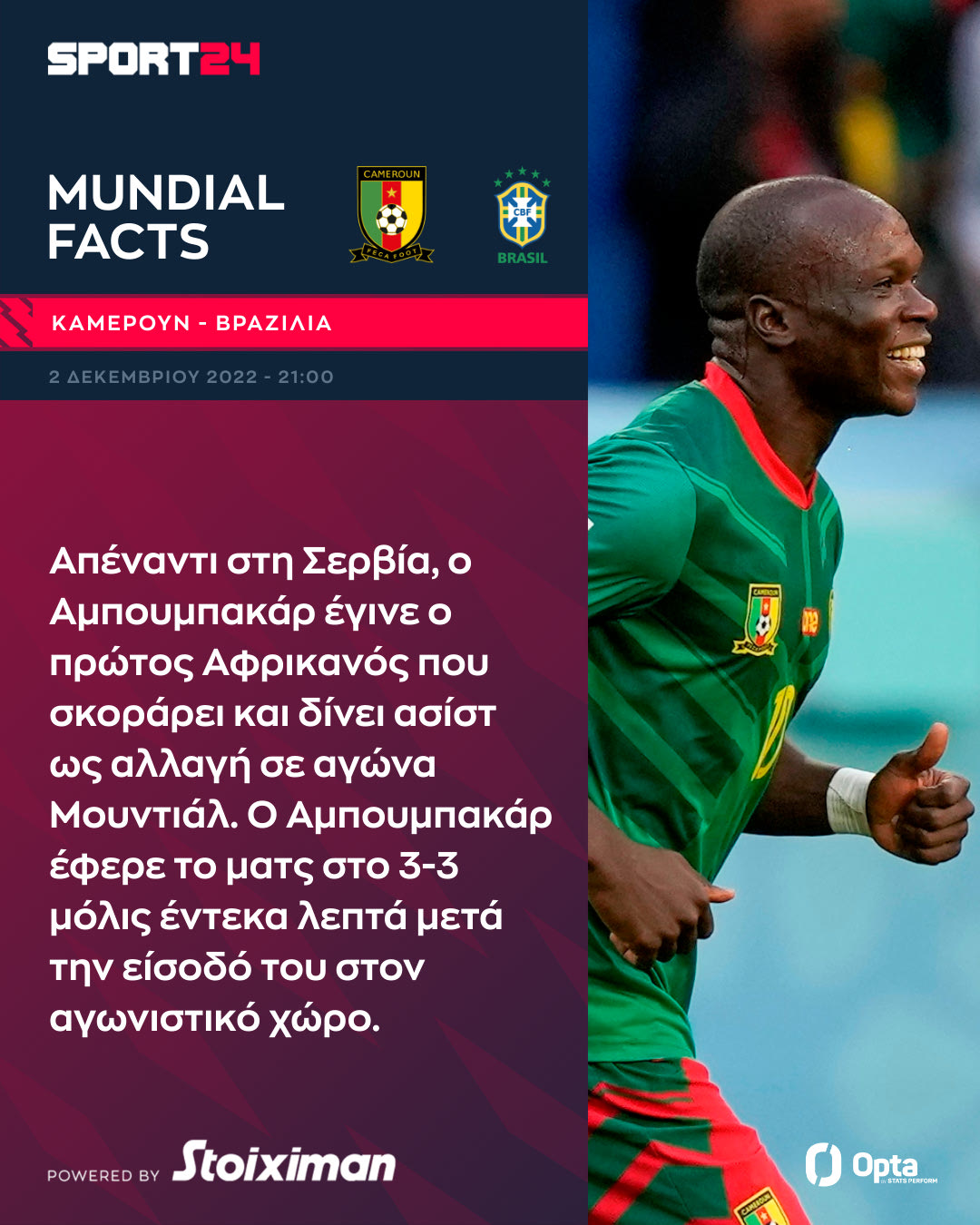 Το Καμερούν ελπίζει μόνο σε νίκη κόντρα στη Βραζιλία (02/12, 21:00, ΑΝΤ1 και Live SPORT24) για την πρόκριση στα νοκ-άουτ του Μουντιάλ 2022, με τη σελεσάο να θέλει απλά να εξασφαλίσει την πρώτη θέση στον όμιλό της.