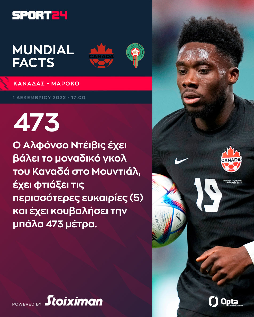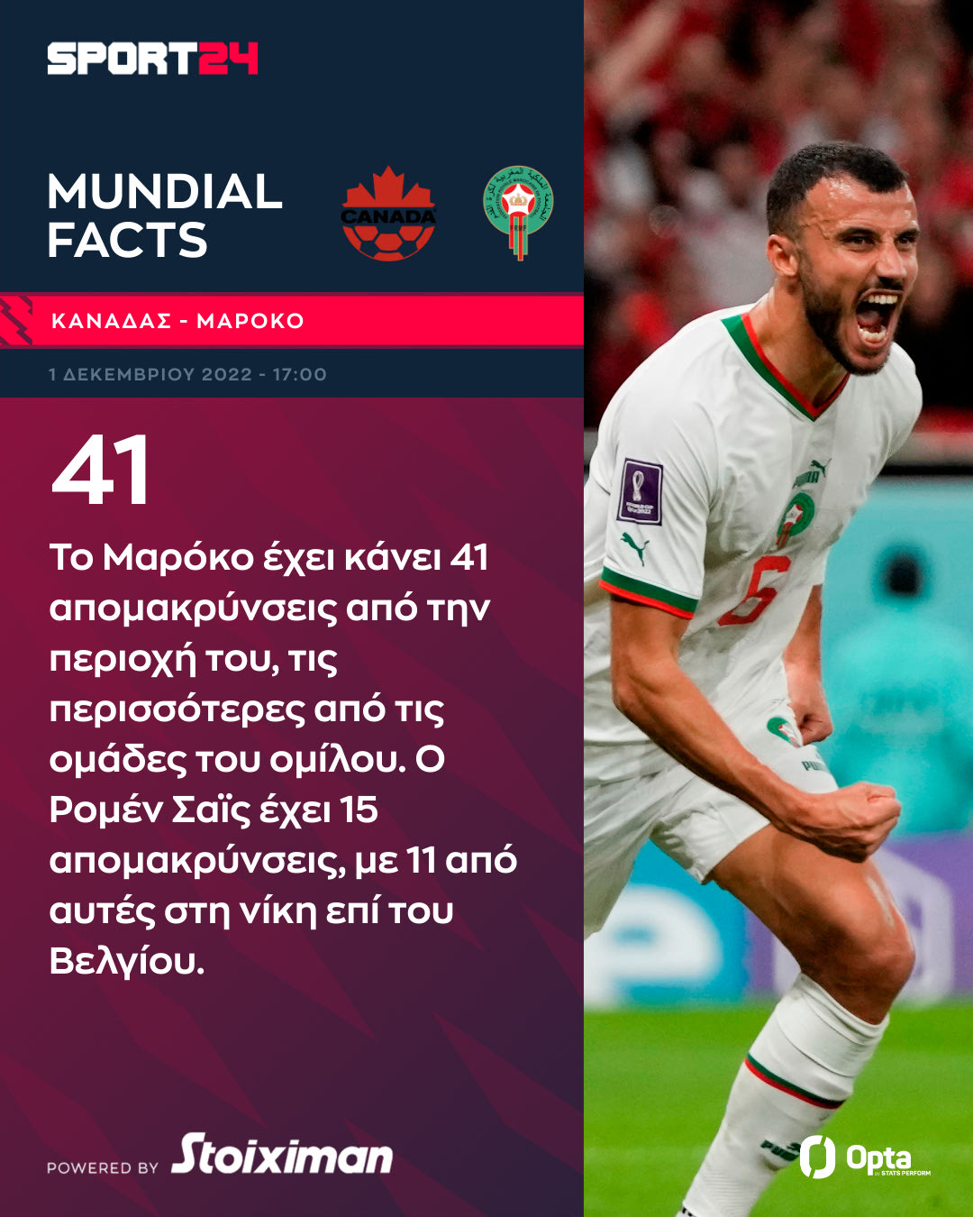 Το Μαρόκο θέλει τη νίκη για να περάσει στον επόμενο γύρο του Μουντιάλ κόντρα στον Καναδά (01/12, 17:00, antenna.gr, ANT1+ και LIVE SPORT24) που θέλει να πετύχει την πρώτη νίκη της ιστορίας του στον θεσμό. Δείτε ορισμένα στοιχεία της αναμέτρησης.