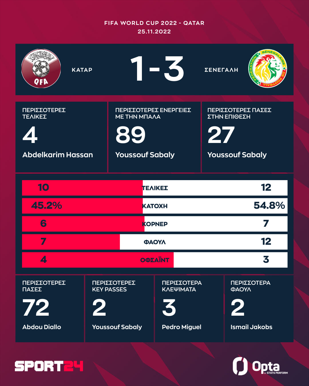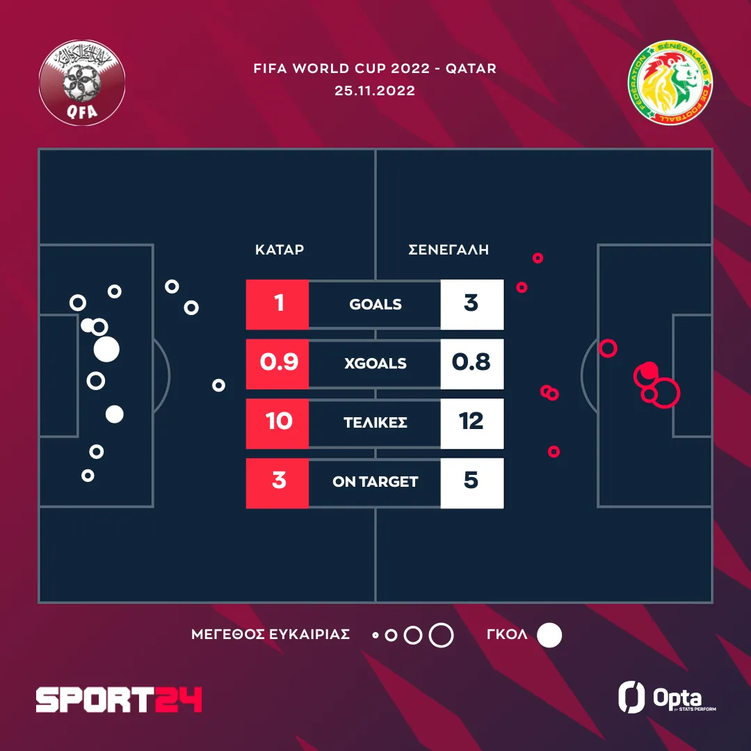 Στο 41′ ο Ντιά άνοιξε το σκορ, ενώ στο 48′ ο Ντιεντιού έκανε δύο τα τέρματα των Σενεγαλέζων. Στο 78′ ο Μουντάρι μείωσε για το Κατάρ, με τον Ντιένγκ στο 84′ να ανεβάζει ξανά τον δείκτη του σκορ.