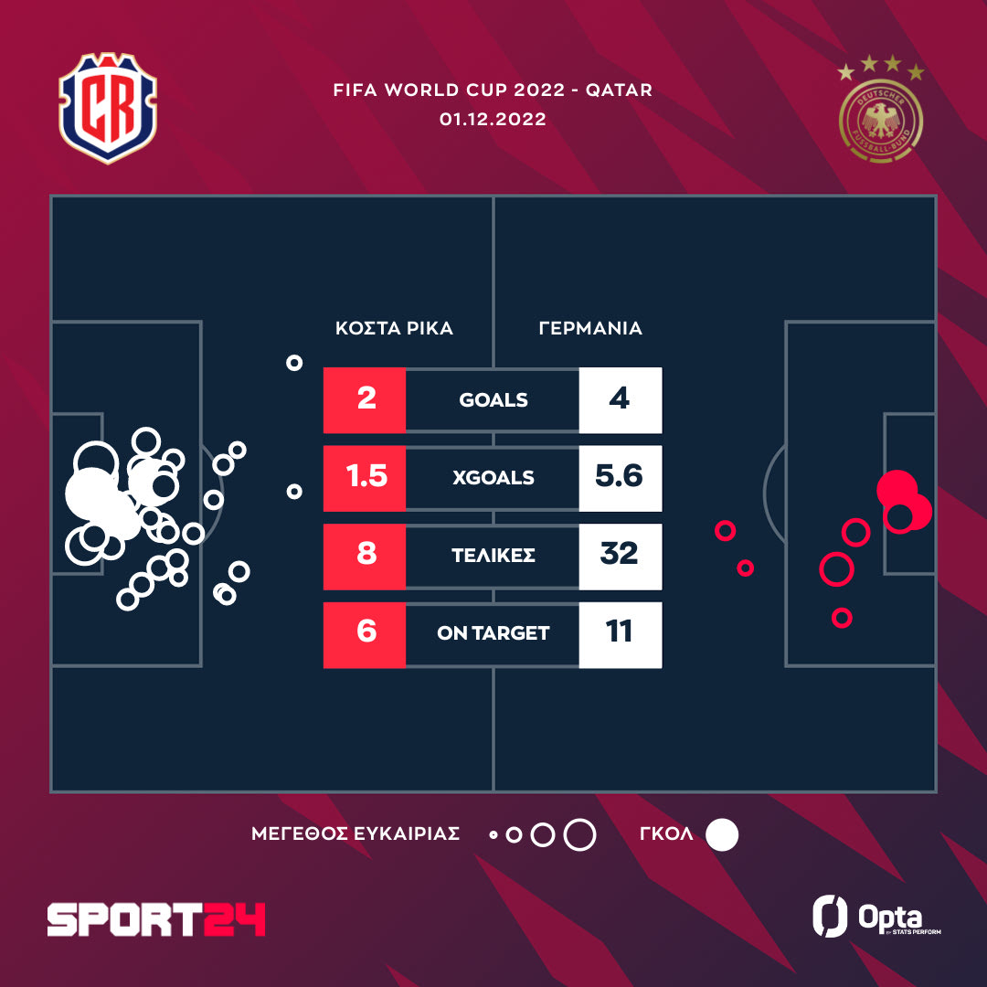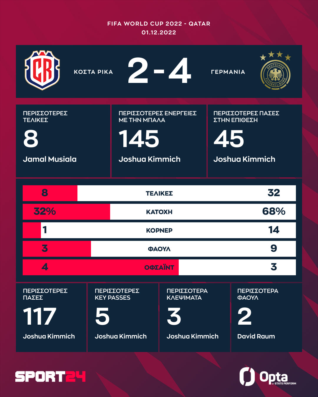 Ο Γκνάμπρι άνοιξε το σκορ στο 19′, με την Κόστα Ρίκα να κάνει την προσωρινή ανατροπή με τον Τεχέδα (58′) και τον Βάργκας (70′). Η ομάδα του Φλικ απάντησε με τους Χάβερτς (73′- 85′) και Φίλκρουγκ (90+1′), αλλά δεν η ανατροπή στην ανατροπή δεν έφτασε.