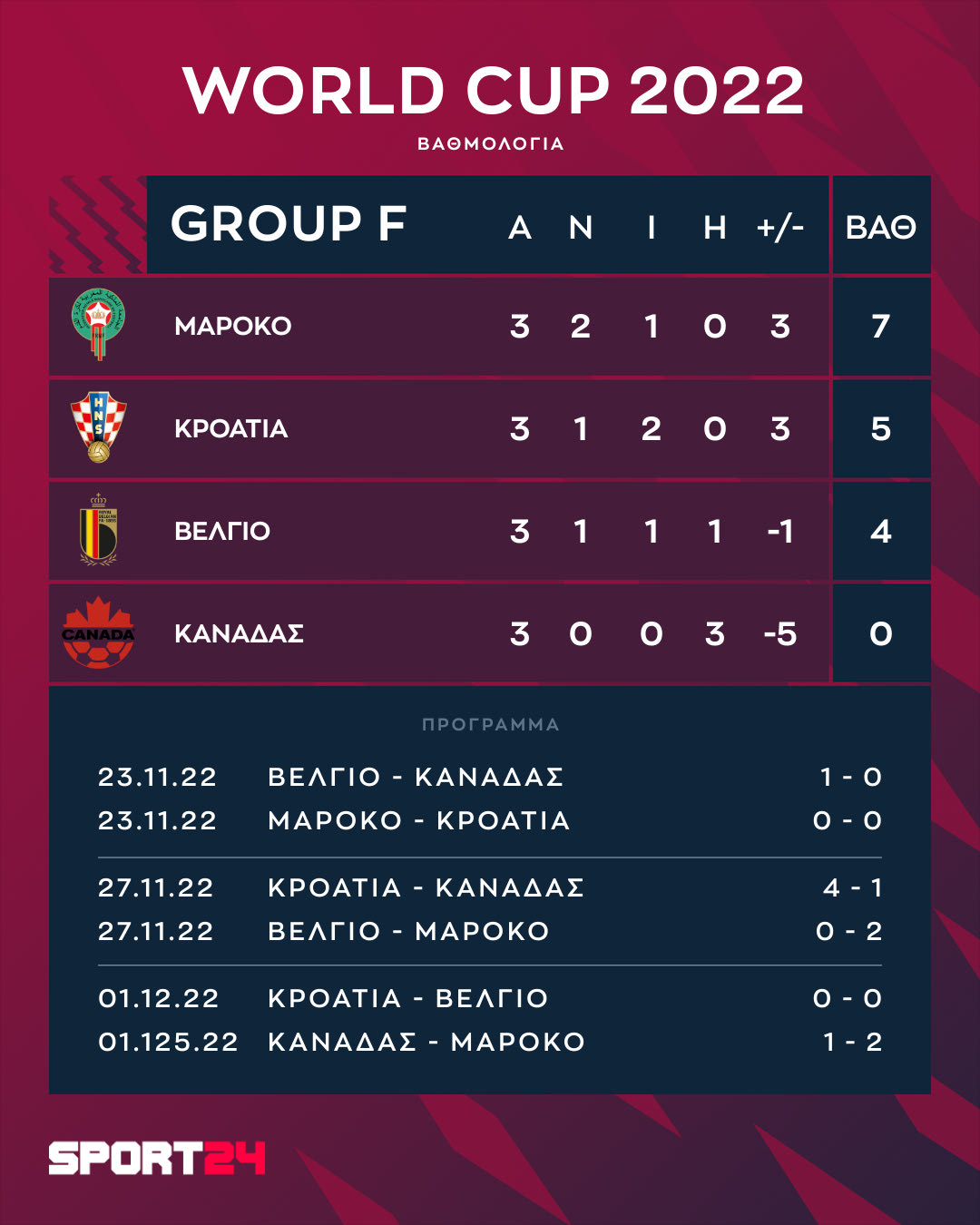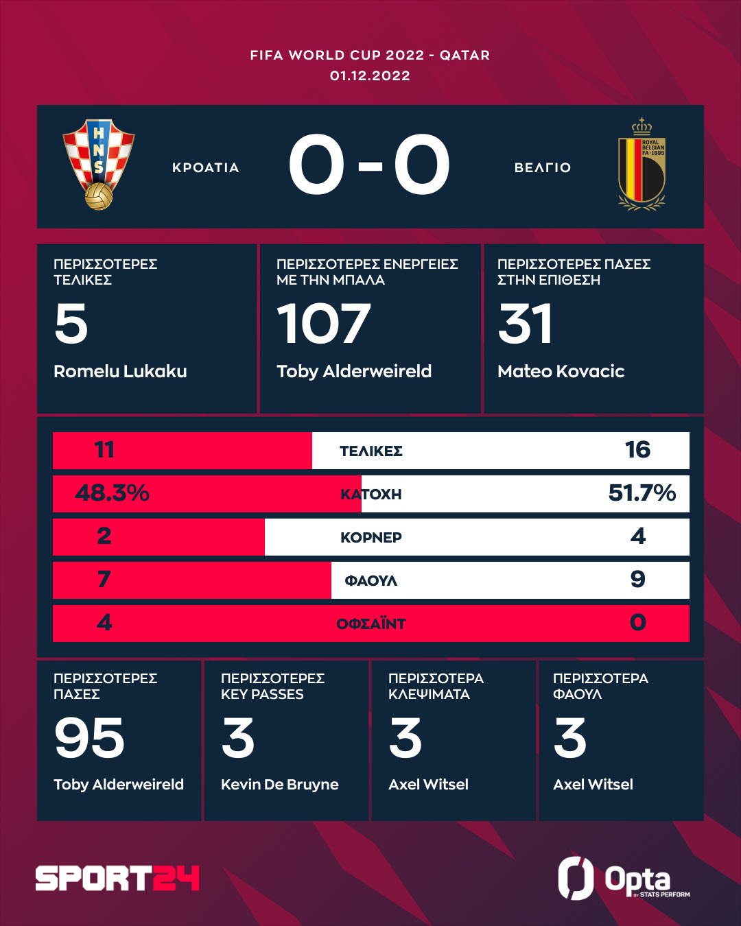 Η Κροατία έμεινε στο 0-0 με το Βέλγιο, αλλά η ισοπαλία ήταν αρκετή για να τη στείλει στα νοκ άουτ από τη 2η θέση του 6ου ομίλου και να αφήσει εκτός συνέχειας τους "κόκκινους διαβόλους". Τέσσερις τεράστιες ευκαιρίες έχασε ο Ρομέλου Λουκάκου στο 2ο ημίχρονο.