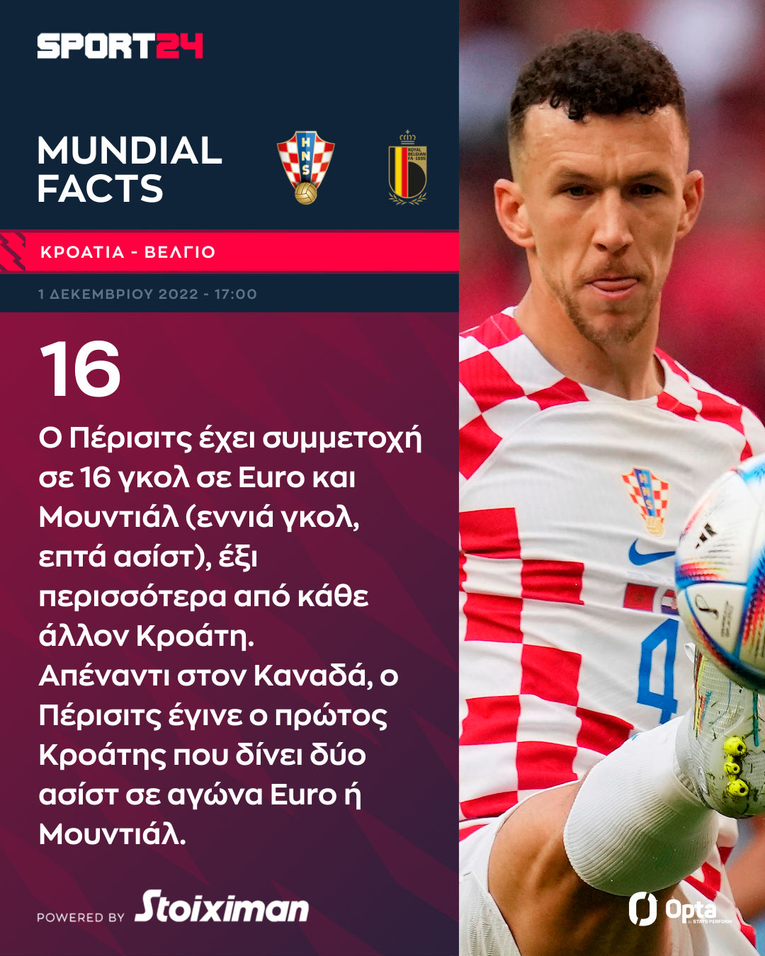 Κροατία και Βέλγιο (01/12, 17:00, ANT1, ANT1+ και LIVE SPORT24) δίνουν έναν "τελικό" πρόκρισης στη φάση των 16 του Μουντιάλ 2022. Δείτε ορισμένα χρήσιμα facts της σπουδαίας μονομαχίας.