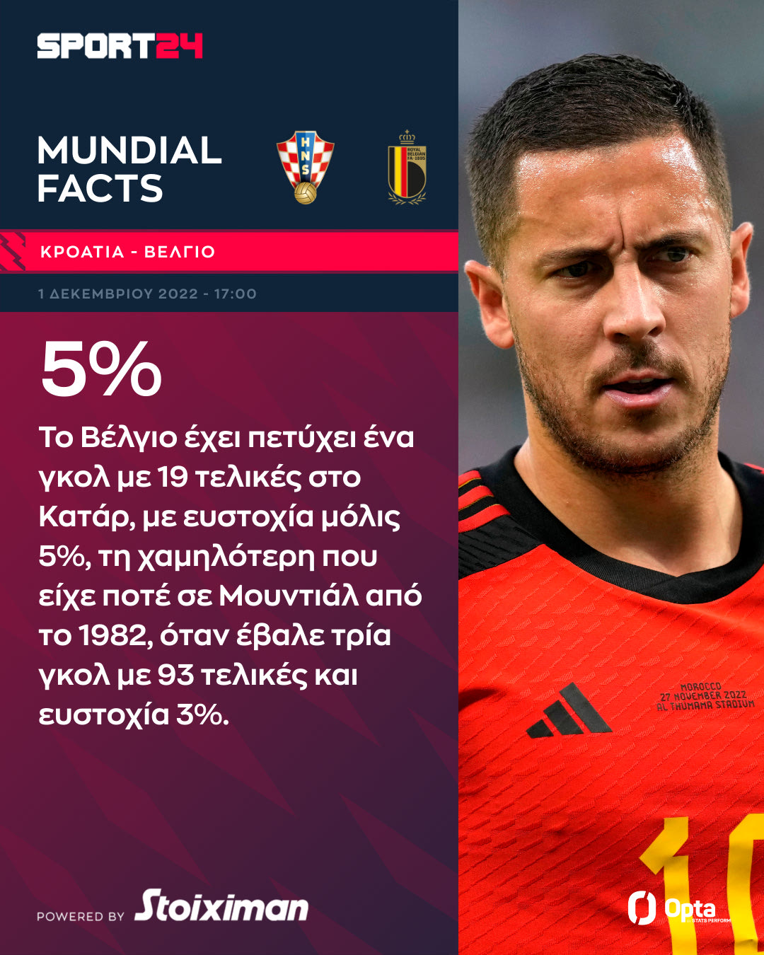 Το Βέλγιο έχει πετύχει ένα γκολ με 19 τελικές στο Κατάρ, με ευστοχία μόλις 5%, τη χαμηλότερη που είχαν ποτέ σε Μουντιάλ από το 3% που είχαν 1982, όταν έβαλαν τρία γκολ με 93 τελικές.