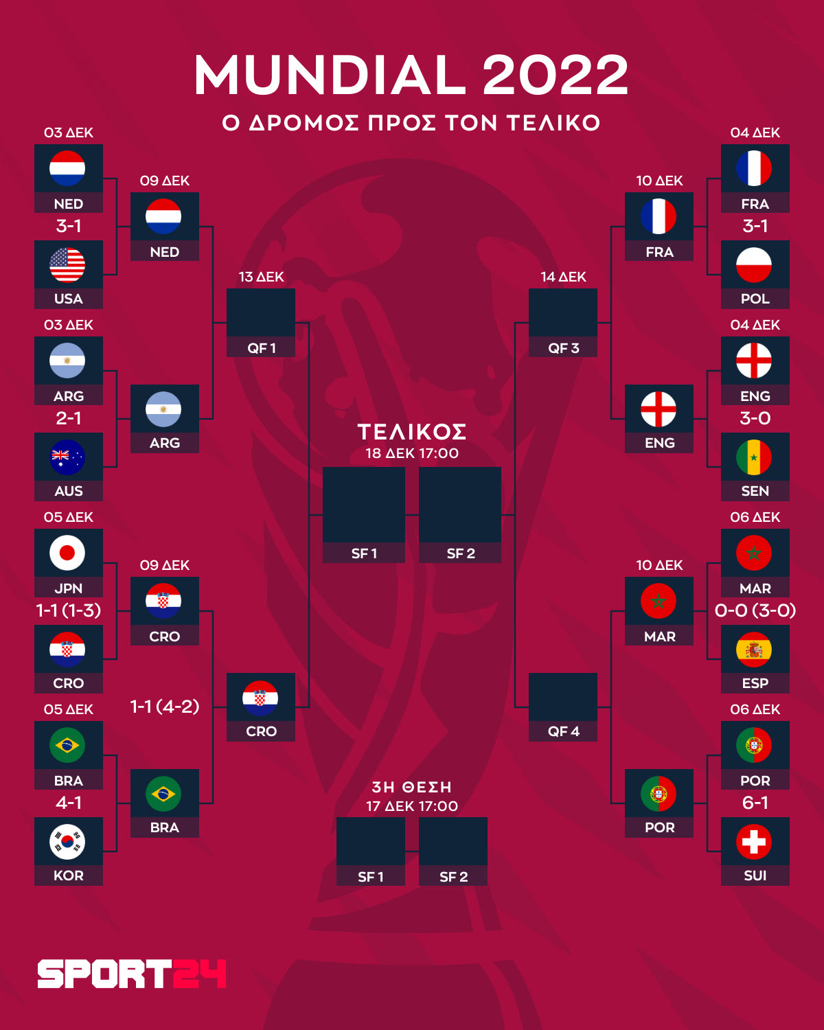 Πλέον, η Κροατία περιμένει στα ημιτελικά το νικητή του βραδινού προημιτελικού μεταξύ Ολλανδίας και Αργεντινής, τον οποίο θα αντιμετωπίσει την Τρίτη στις 21:00 ώρα Ελλάδας.