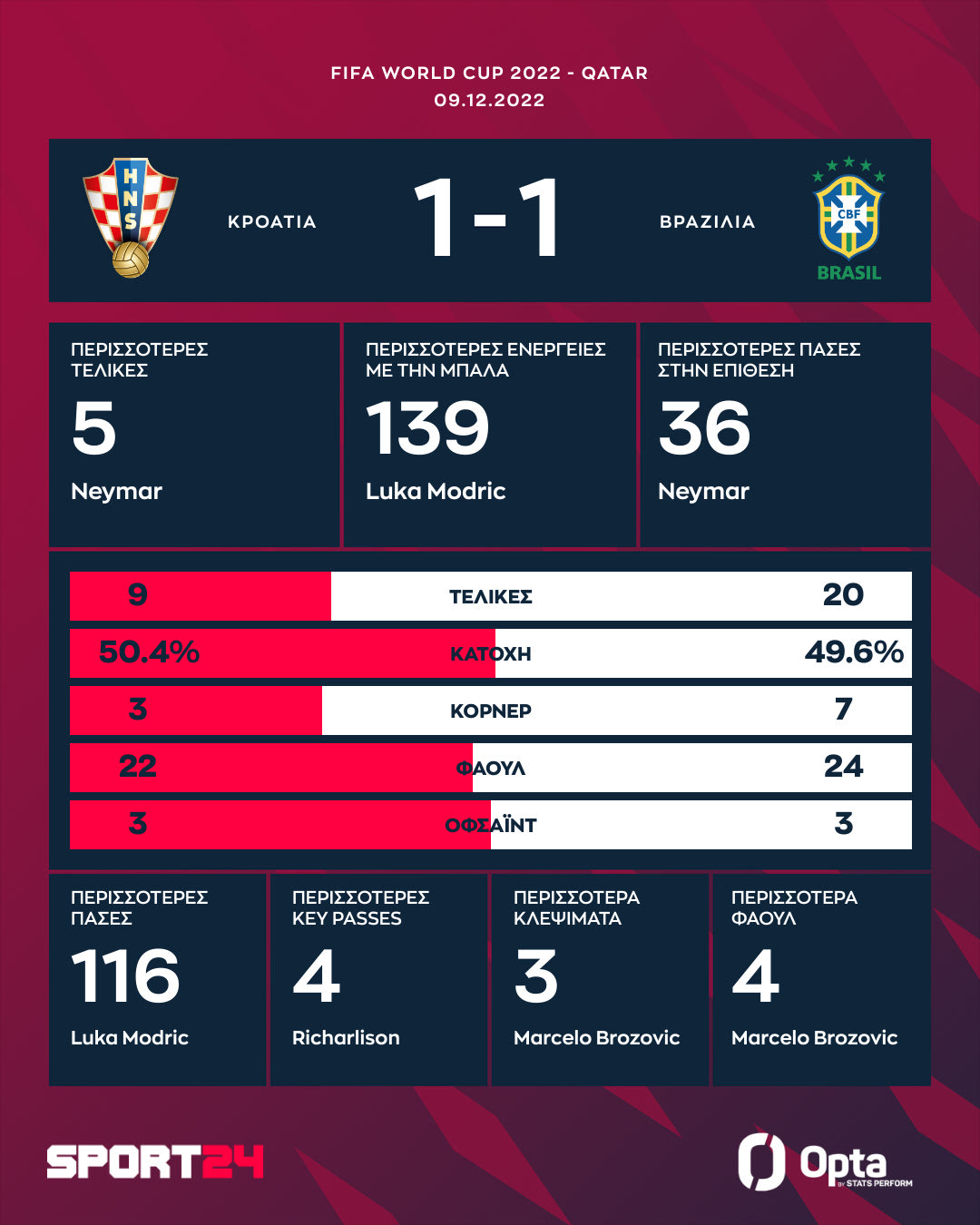 Ο Ντόμινικ Λιβάκοβιτς έκανε ρεκόρ επεμβάσεων για τερματοφύλακα από την πατρίδα του, η Κροατία δεν είχε πρόβλημα να παίξει ακόμα μια παράταση, την όγδοη στα τελευταία εννέα νοκ άουτ της σε μεγάλη διοργάνωση και τελικά, όταν έστειλε τον αγώνα στα πέναλτι, δικαιώθηκε! Η Βραζιλία λύγισε και οι Κροάτες με 4-2 προκρίθηκαν στα ημιτελικά του Μουντιάλ 2022.