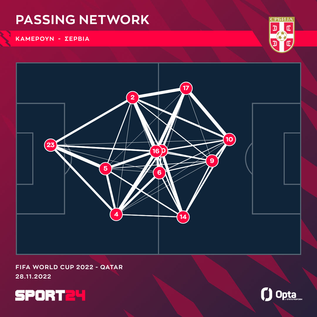 Μεγάλος πρωταγωνιστής για τους Σέρβους ο Άντριγια Ζίβκοβιτς, ο οποίος έδωσε δύο ασίστ, ενώ είχε γενικότερα μία εξαιρετική παρουσία. Όπως φαίνεται και στο γράφημα της Opta/Stats Perform, ο παίκτης του ΠΑΟΚ κινήθηκε ψηλά στο γήπεδο και παράλληλα με τον Φίλιπ Κόστιτς, παίρνοντας όλη την πλευρά πάνω τους, αφού η Σερβία αγωνίστηκε με τριάδα στην άμυνα.