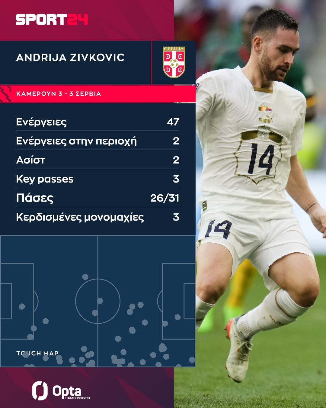 Η Σερβία αναδείχθηκε ισόπαλη 3-3 με το Καμερούν, με τον Άντριγια Ζίβκοβιτς να είναι εκ των πρωταγωνιστών, με δύο ασίστ, αλλά και γενικότερα μία αξιοσημείωτη παρουσία ως δεξιός χαφ-εξτρέμ.