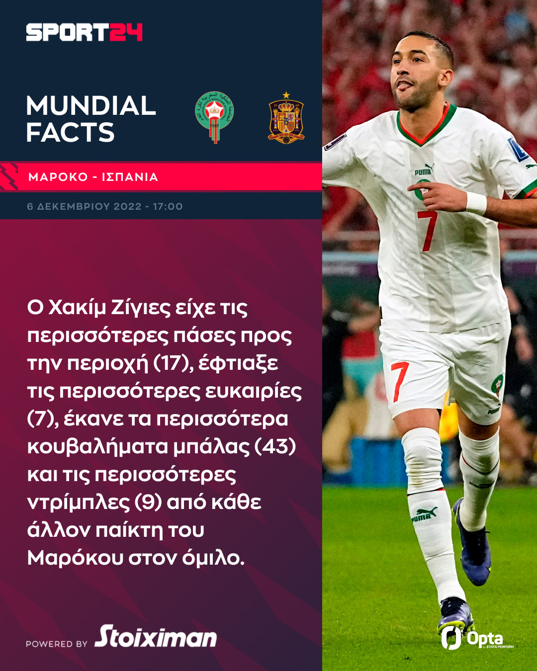 Ο Χακίμ Ζίγες είχε τις περισσότερες πάσες προς την περιοχή (17), δημιούργησε τις περισσότερες ευκαιρίες (7), έκανε τα περισσότερα κουβαλήματα μπάλας (43) και τις περισσότερες ντρίμπλες (9) από κάθε άλλον παίκτη του Μαρόκου στον όμιλο.