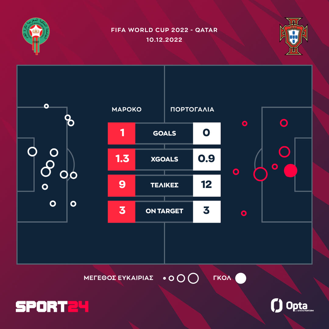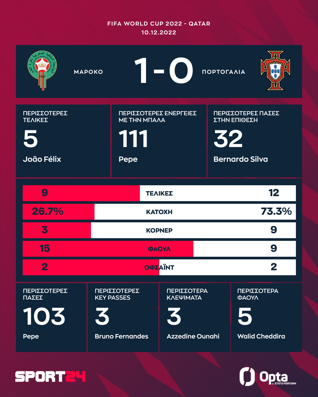 Στο 90+7′ ο Πέπε έχασε τεράστια ευκαιρία να γίνει ήρωας για την Πορτογαλία όταν αμαρκάριστος από το ύψος της μικρής περιοχής έστειλε τη μπάλα ελάχιστα άουτ, με τη φάση αυτή να βάζει ταφόπλακα στις ελπίδες των Ιβήρων για την ισοφάριση και να υπογράφει μία μεγαλειώδη και συνάμα ιστορική πρόκριση του Μαρόκου στους “4” του Παγκοσμίου Κυπέλλου.