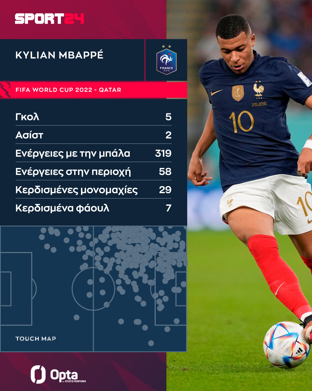 Επιπλέον, έχει συνολικά 319 ενέργειες με την μπάλα, εκ των οποίων οι 58 είναι μέσα στη μεγάλη περιοχή. Ας μην ξεχνάμε άλλωστε πως απέναντι στην Αυστραλία, ο Εμπαπέ ισοφάρισε ρεκόρ 52 ετών, έχοντας 19 ενέργειες μέσα στη μεγάλη περιοχή. Τέλος, ο Γάλλος σούπερ σταρ έχει 29 κερδισμένες μονομαχίες, αλλά και 7 κερδισμένα φάουλ στο τουρνουά.