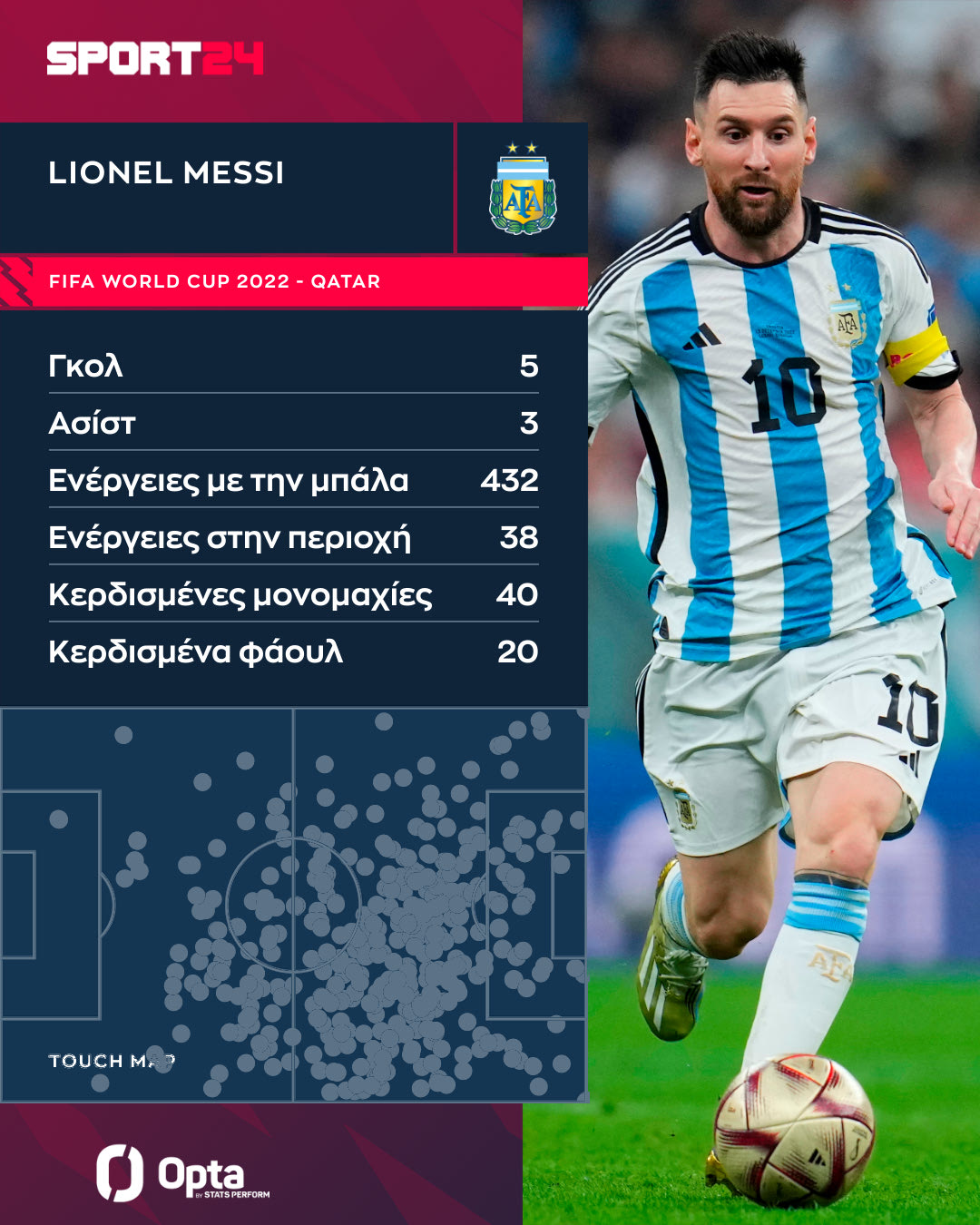 Ο Μέσι έχει σημειώσει πέντε γκολ (τα τρία με πέναλτι) και έχει μοιράσει τρεις ασίστ, ενώ έχει συνολικά και 432 ενέργειες με την μπάλα, το οποίο μεταφράζεται σε 72 επαφές ανά 90′. Ένα εντυπωσιακό νούμερο, αν σκεφτεί κανείς πως πρόκειται για έναν επιθετικό και όχι έναν μέσο ή αμυντικό. Αυτό, βέβαια, αποδεικνύει και την τεράστια επιρροή που έχει στο παιχνίδι της Αργεντινής, αλλά και τη μοναδικότητα που έχει ως παίκτης.