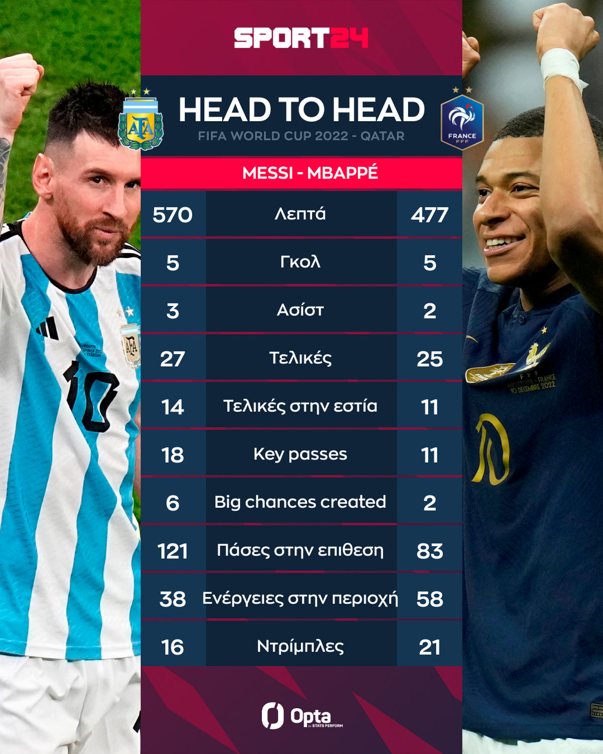 Είναι εμφανές, λοιπόν, πως οι δύο παίκτες κάνουν τη διαφορά και αποτελούν τους ηγέτες της Αργεντινής και της Γαλλίας. Στο τέλος, όμως, της βραδιάς ένας θα χαμογελάσει και θα σηκώσει το τρόπαιο του Παγκοσμίου Κυπέλλου.