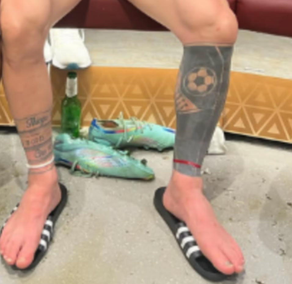 Φωτογραφίες που τον δείχνουν να πανηγυρίζει στα αποδυτήρια έπειτα από τη νίκη στα πέναλτι στον τελικό κόντρα στη Γαλλία, ο Αργεντινός σούπερ σταρ φοράει δύο κορδέλες στους αστραγάλους του, μία λευκή και μία κόκκινη.