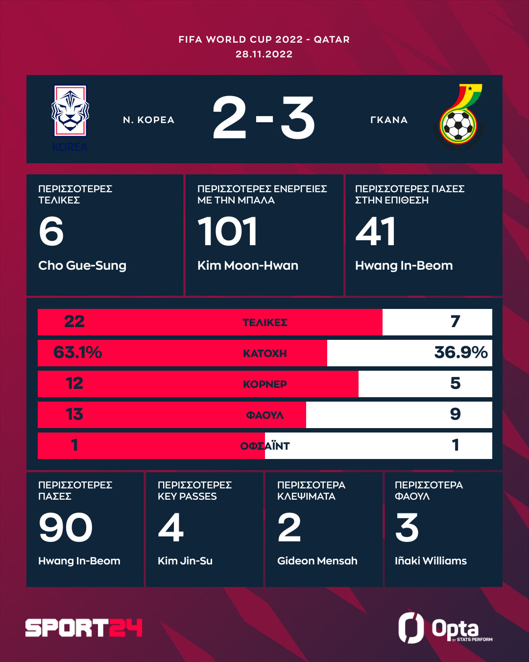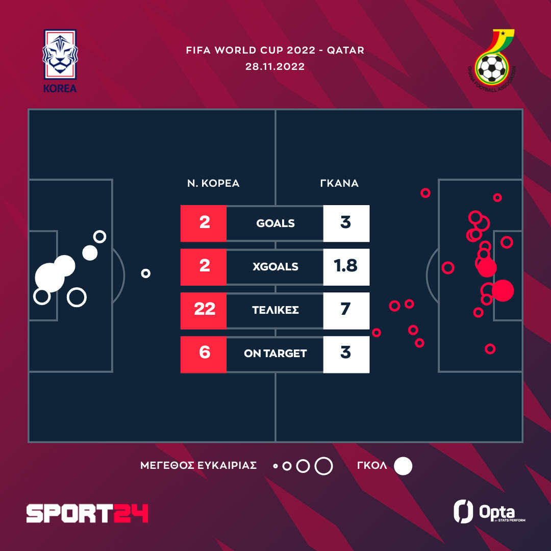 Το φινάλε βρήκε την Νότια Κορέα να έχει 22 τελικές (6 εντός εστίας) έναντι μόλις 7 της Γκάνας (3 εντός εστίας), ωστόσο στην στατιστική κατηγορία που μετράει περισσότερο (τα γκολ) υστέρησε και έτσι έμεινε με τις εντυπώσεις υπέρ της αλλά και με άδεια χέρια, με την Γκάνα στον αντίποδα να πανηγυρίζει μία νίκη χρυσάφι στην προσπάθεια που κάνει για την είσοδο στους 16.