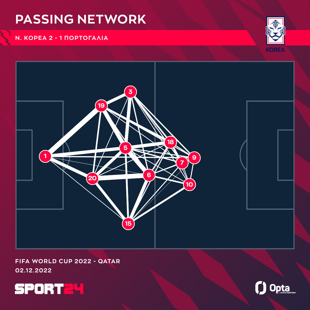 Ο χώρος δράσης και το δίκτυο μεταβιβάσεων των παικτών της Κορέας κόντρα στην Πορτογαλία