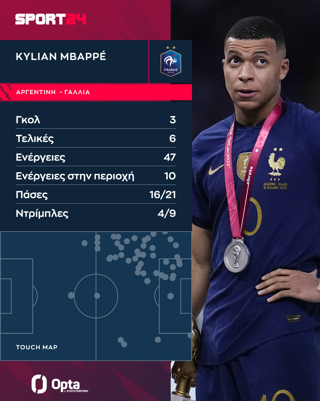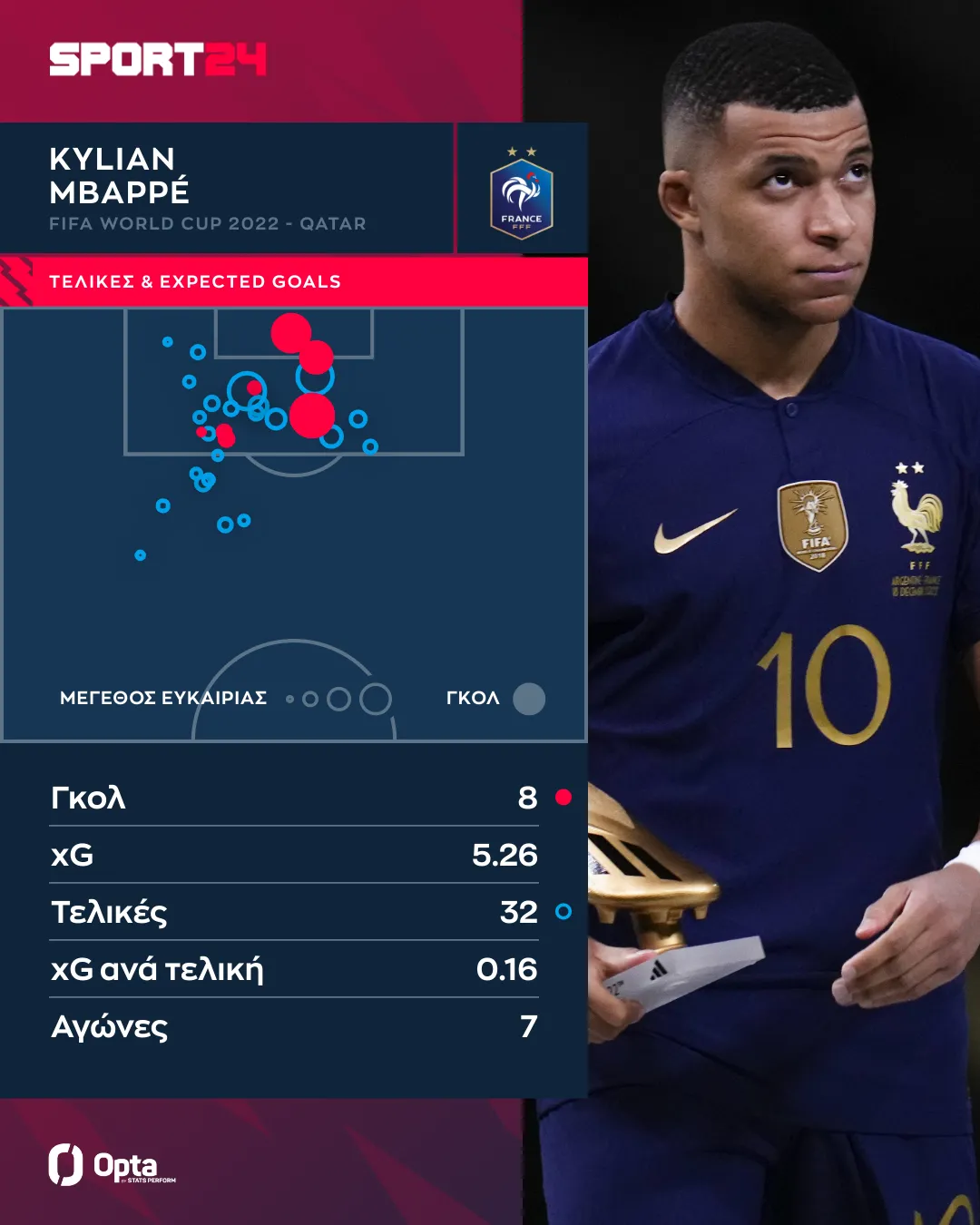Παράλληλα, ο Εμπαπέ έφτασε τα οκτώ γκολ στα γήπεδα του Κατάρ και κατέκτησε την Χρυσή Μπάλα του Μουντιάλ, το βραβείο του πρώτου σκόρερ του τουρνουά. Στο παρακάτω γράφημα της Opta/Stats Perform μπορείτε να δείτε όλες τις τελικές και τα xGoals του ποδοσφαιριστή της Παρί.