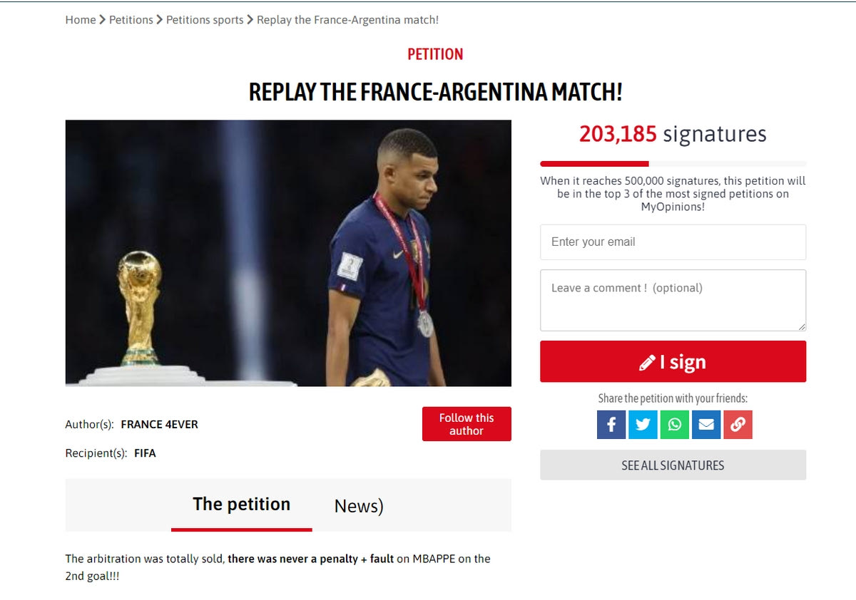 “Η διαιτησία ήταν εντελώς πουλημένη, δεν υπήρξε ποτέ πέναλτι συν φάουλ στον Εμπαπέ στο δεύτερο γκολ της Αργεντινής (του Ντι Μαρία). Υπογράψτε και διαδώστε για να ξαναγίνει το παιχνίδι”, αναφέρει η περιγραφή της αίτησης, με τις 500.000 υπογραφές να είναι το ταβάνι.