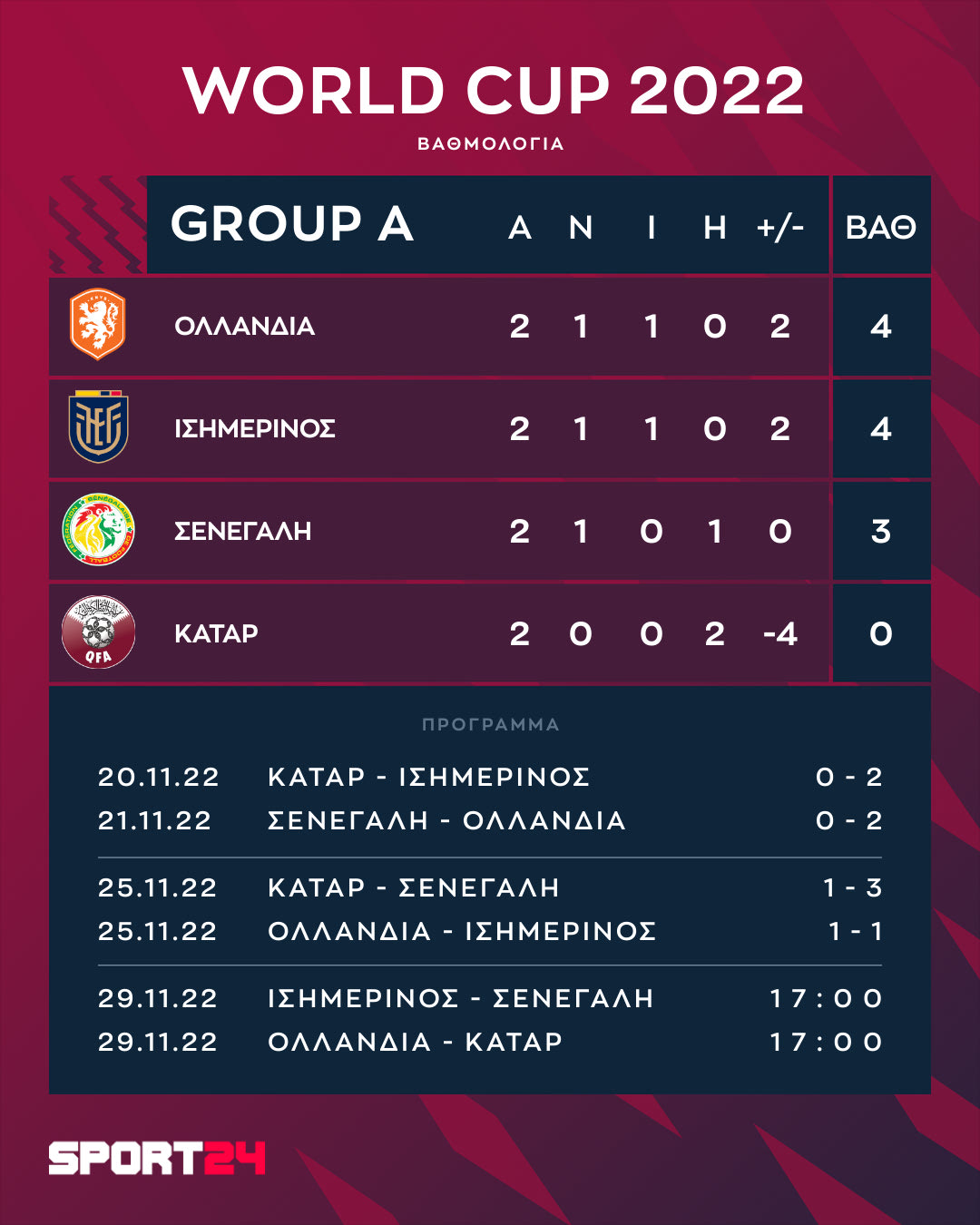 Στον πρώτο όμιλο, η Ολλανδία με το Εκουαδόρ είναι στους τέσσερις βαθμούς, ακολουθεί η Σενεγάλη με τρεις πόντους και τελευταίο το αποκλεισμένο Κατάρ με μηδέν.