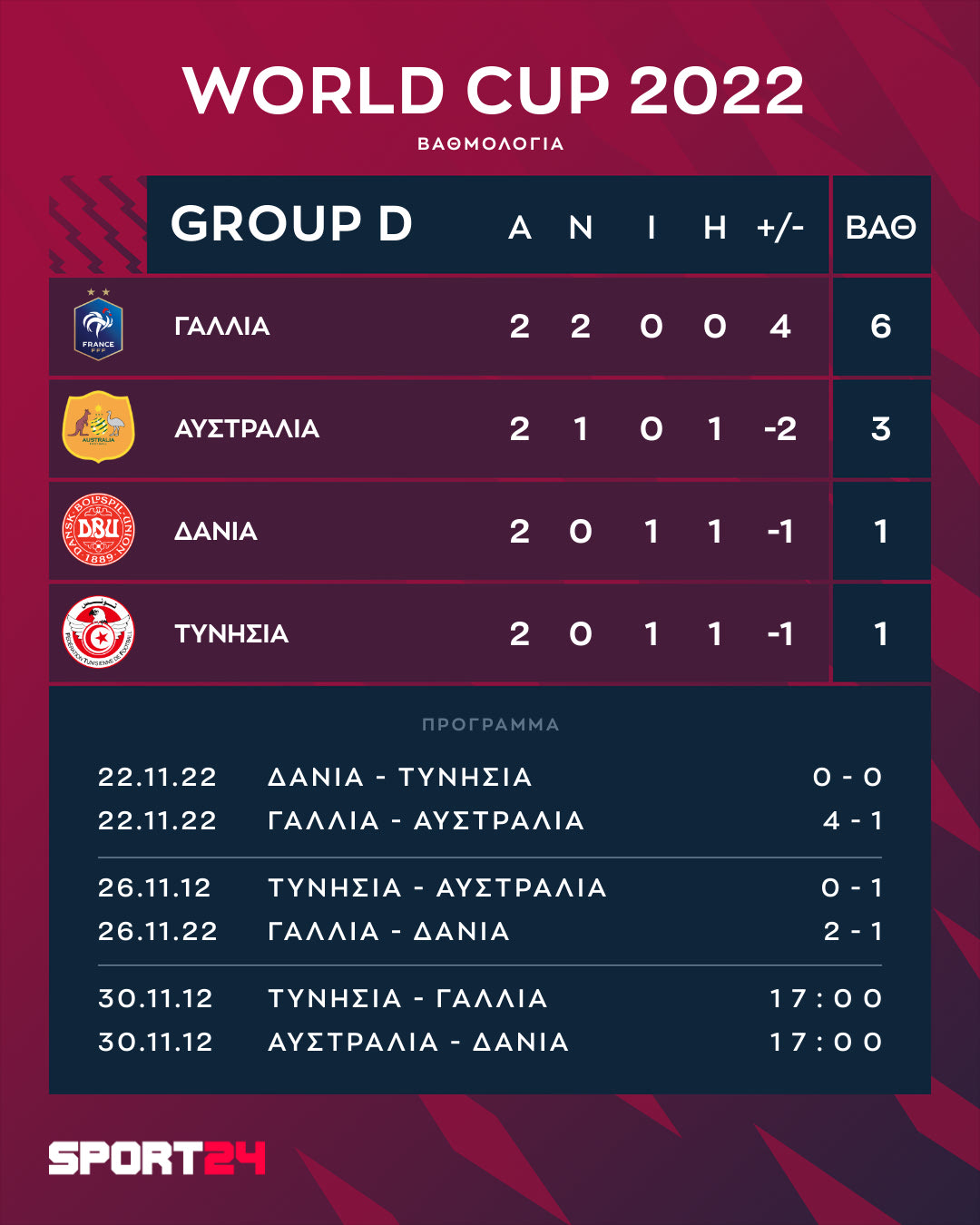 Στον τέταρτο όμιλο η Γαλλία έχει πάρει ήδη το εισιτήριο για τα νοκ-άουτ και βρίσκεται στην κορυφή με έξι βαθμούς. Ακολουθεί η Αυστραλία με τρεις, η Δανία με έναν, όσους έχει και η Τυνησία.
