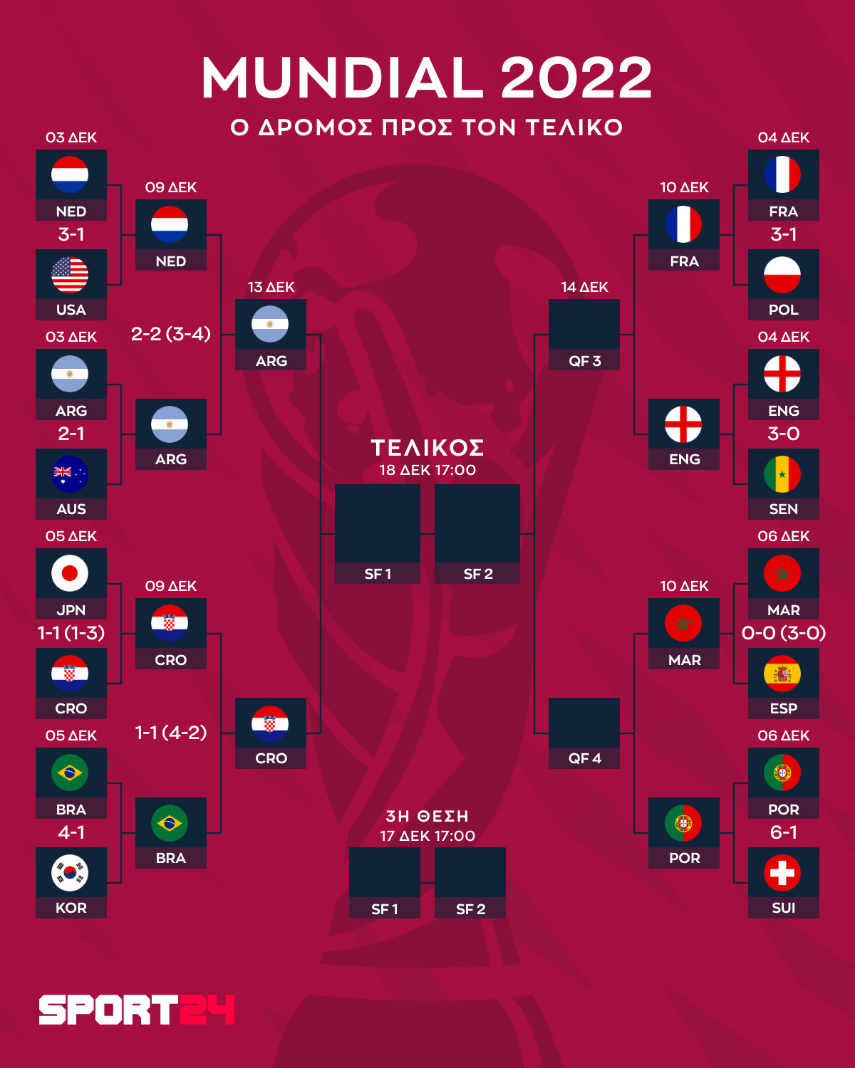 Το SPORT24 παίζει μόνο Μουντιάλ 2022 και σε πάει στο Παγκόσμιο Κύπελλο ! Δες αναλυτικα το Πρόγραμμα του Μουντιάλ και τα αποτελέσματα των αγώνων του Μουντιάλ, Παρακολούθησε το Μουντιάλ live στο Matchcenter, κάνε εγγραφή στα push notifications του SPORT24 και στο Youtube κανάλι για να ενημερώνεσαι και να μη χάνεις καμία αθλητική στιγμή!