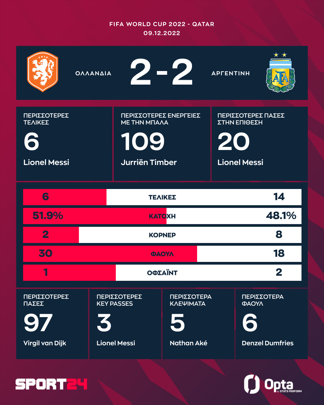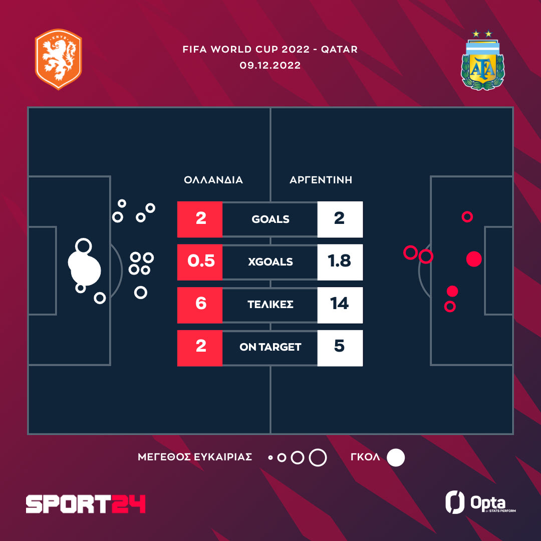 Ο Λιονέλ Μέσι με φανταστική ασίστ και πέναλτι βρέθηκε αντίπαλο στον Βόουτ Βέχορστ που με δύο γκολ στο τέλος έστειλε τη ματσάρα της Αργεντινής με την Ολλανδία στην παράταση κι από εκεί στα πέναλτι. Οι Εμιλιάνο και Λαουτάρο Μαρτίνες όμως στάθηκαν στο ύψος τους και με 4-3 οδήγησαν την Αλμπισελέστε στα ημιτελικά, πάνω στην Κροατία.