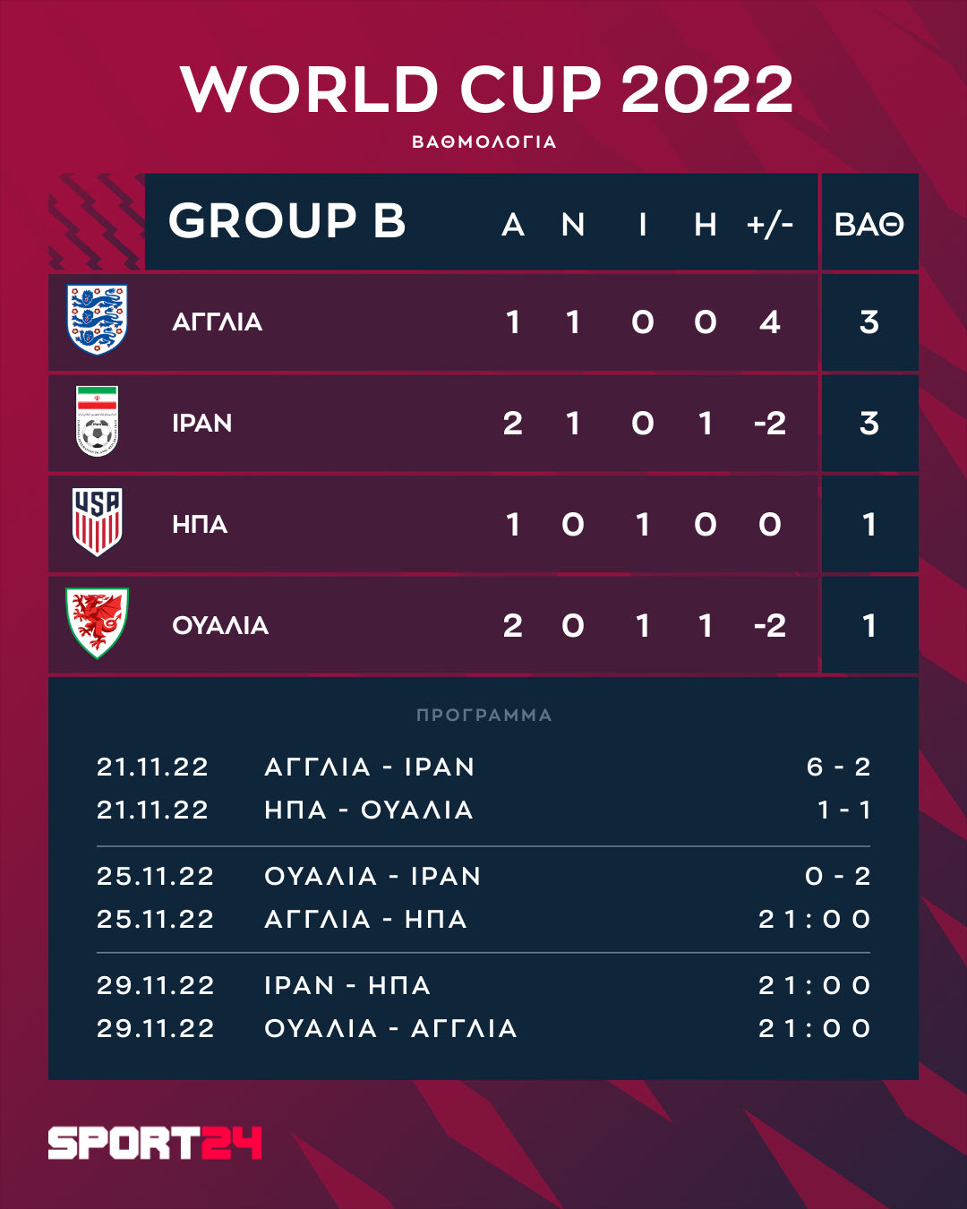 • 21:00 Αγγλία – ΗΠΑ (Αλ Μπαίτ Stadium) ΑΝΤ1 / ΑΝΤ1+