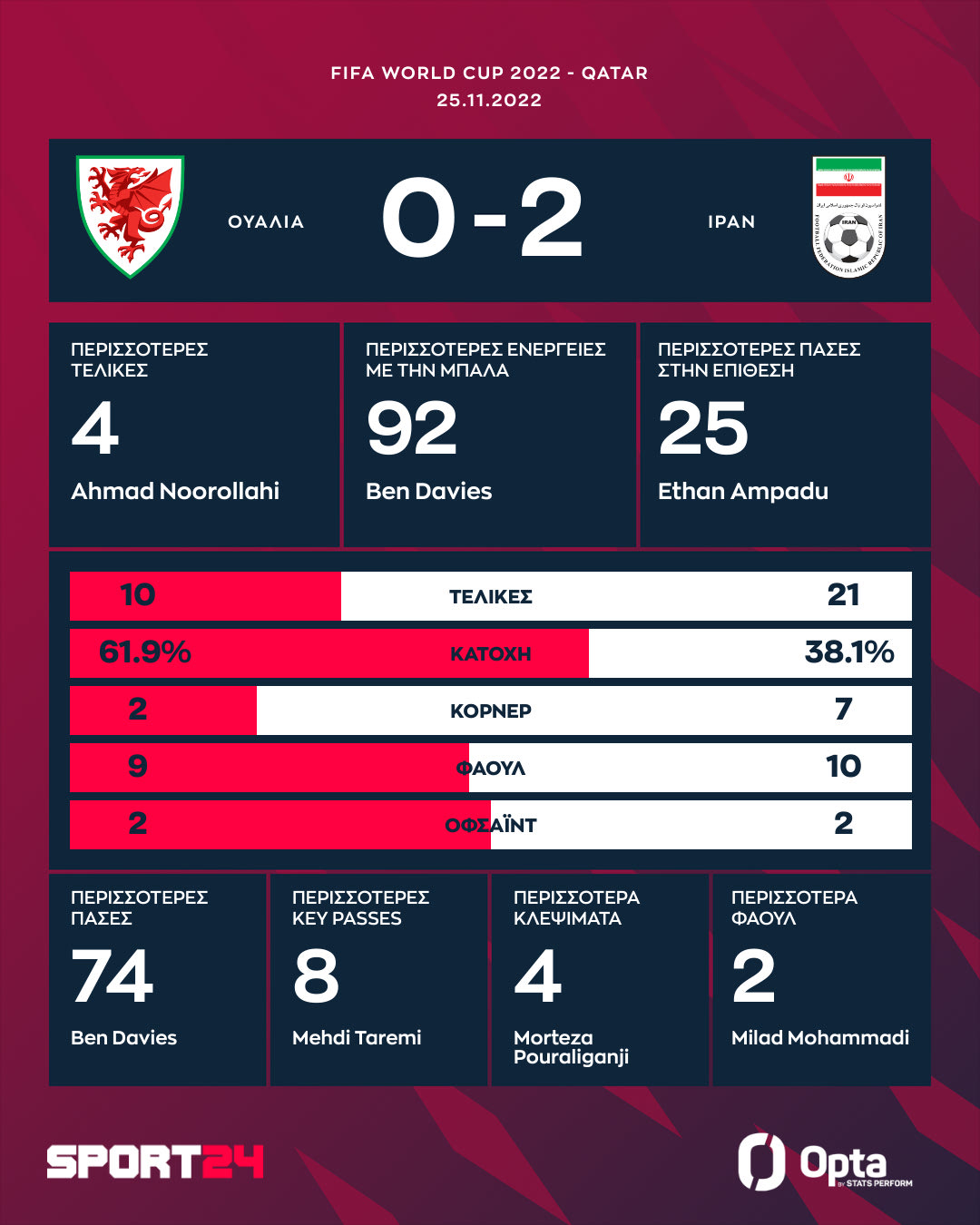 Μια απόλυτα δίκαιη νίκη πήρε το Ιράν απέναντι στην Ουαλία με 2-0. Οι Ιρανοί ήταν καλύτεροι είχαν τις μεγαλύτερες ευκαιρίες και δικαιώθηκαν με δύο γκολ στις καθυστερήσεις.