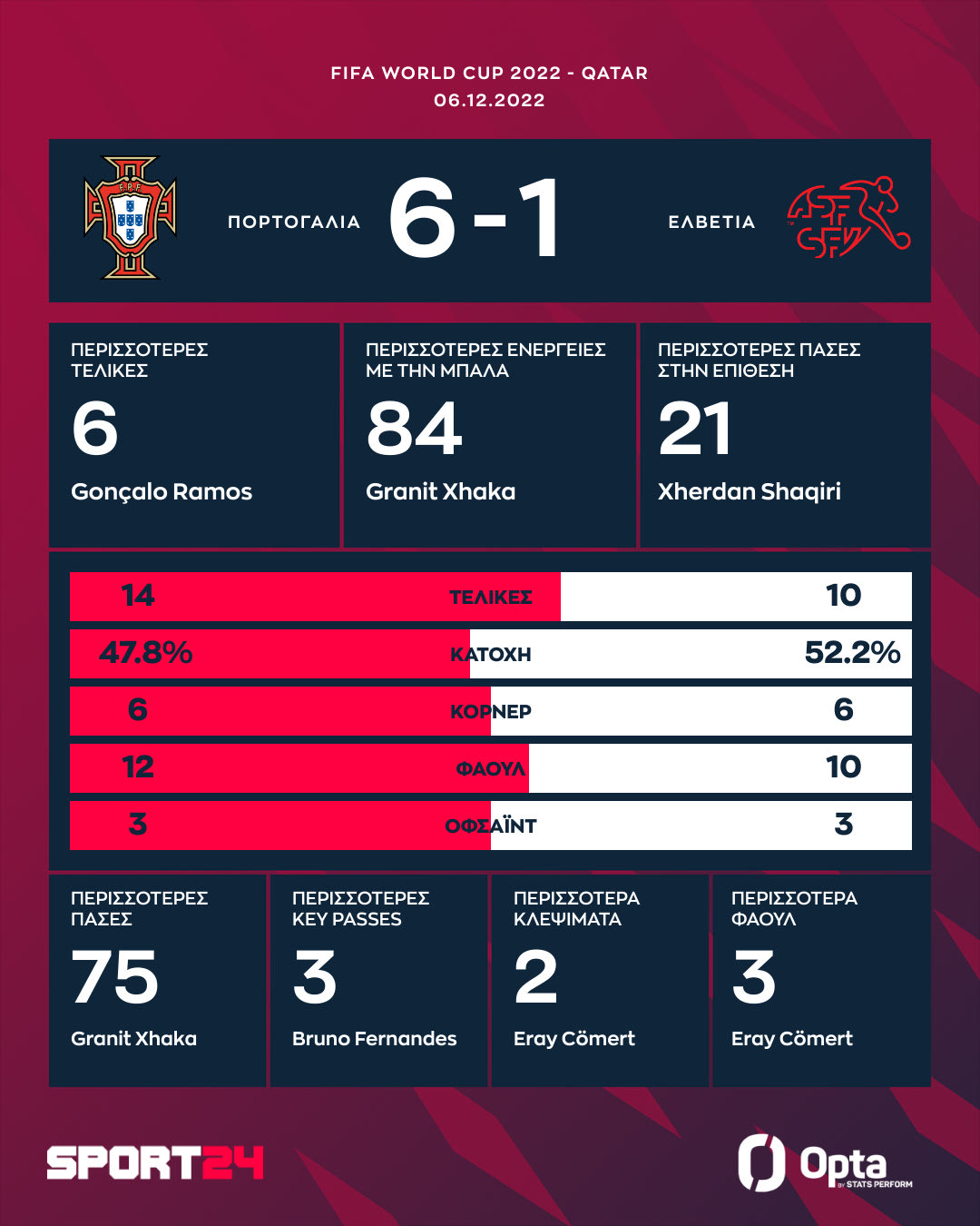 Ο Γκονσάλο Ράμος αντικατέστησε τον Κριστιάνο Ρονάλντο στο αρχικό σχήμα του Φερνάντο Σάντος και σημείωσε χατ τρικ στο θριαμβευτικό 6-1 επί της Ελβετίας για τη φάση των 16 του Μουντιάλ 2022. Το Μαρόκο επόμενος αντίπαλος στα προημιτελικά το Σάββατο.