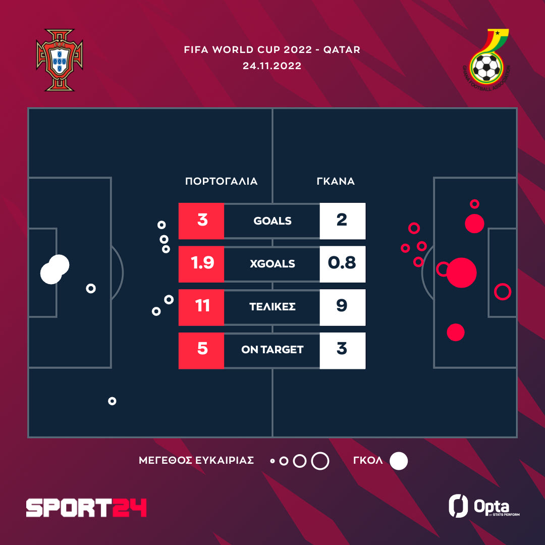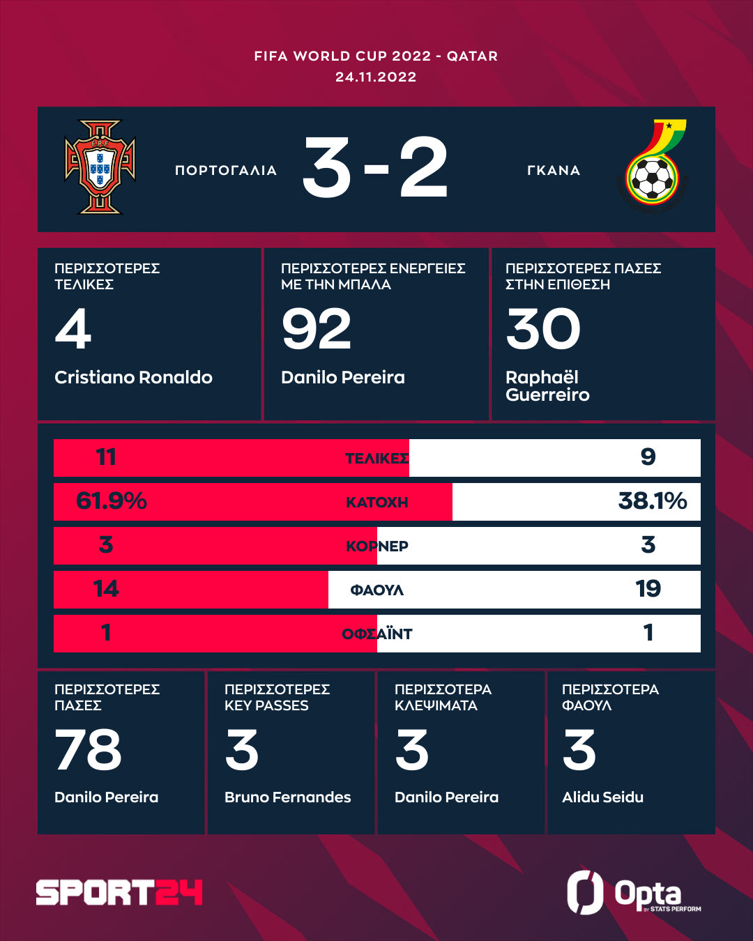 Η Πορτογαλία δεν την πάτησε όπως προηγούμενα φαβορί της διοργάνωσης που προηγήθηκαν απέναντι σε αντίπαλο που δεν απειλούσε. Η Γκάνα πήγε να κάνει τη μεγάλη ανατροπή, όμως ο Μπρούνο Φερνάντες έβαλε τα πράγματα στη θέση τους και το 3-2 δεν χαλασε τη βραδιά του Κριστιάνο Ρονάλντο.