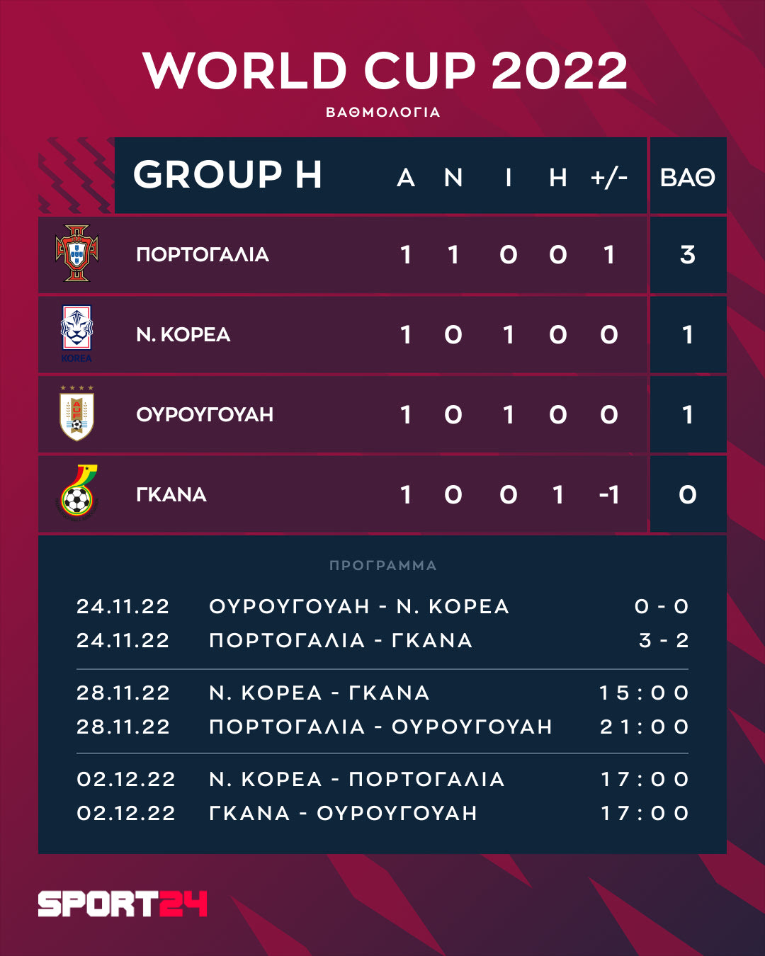 Η Πορτογαλία έκανε ιδανική αρχή στο Μουντιάλ 2022, αφού επικράτησε με 3-2 της Γκάνας για την πρεμιέρα του 8ου ομίλου. Ο Κριστιάνο Ρονάλντο σκόραρε για πέμπτο διαφορετικό Παγκόσμιο Κύπελλο και οι Ζοάο Φέλιξ και Ραφαέλ Λεάο άφησαν πίσω την προσωρινή ισοφάριση του Αντρέ Αγιού.