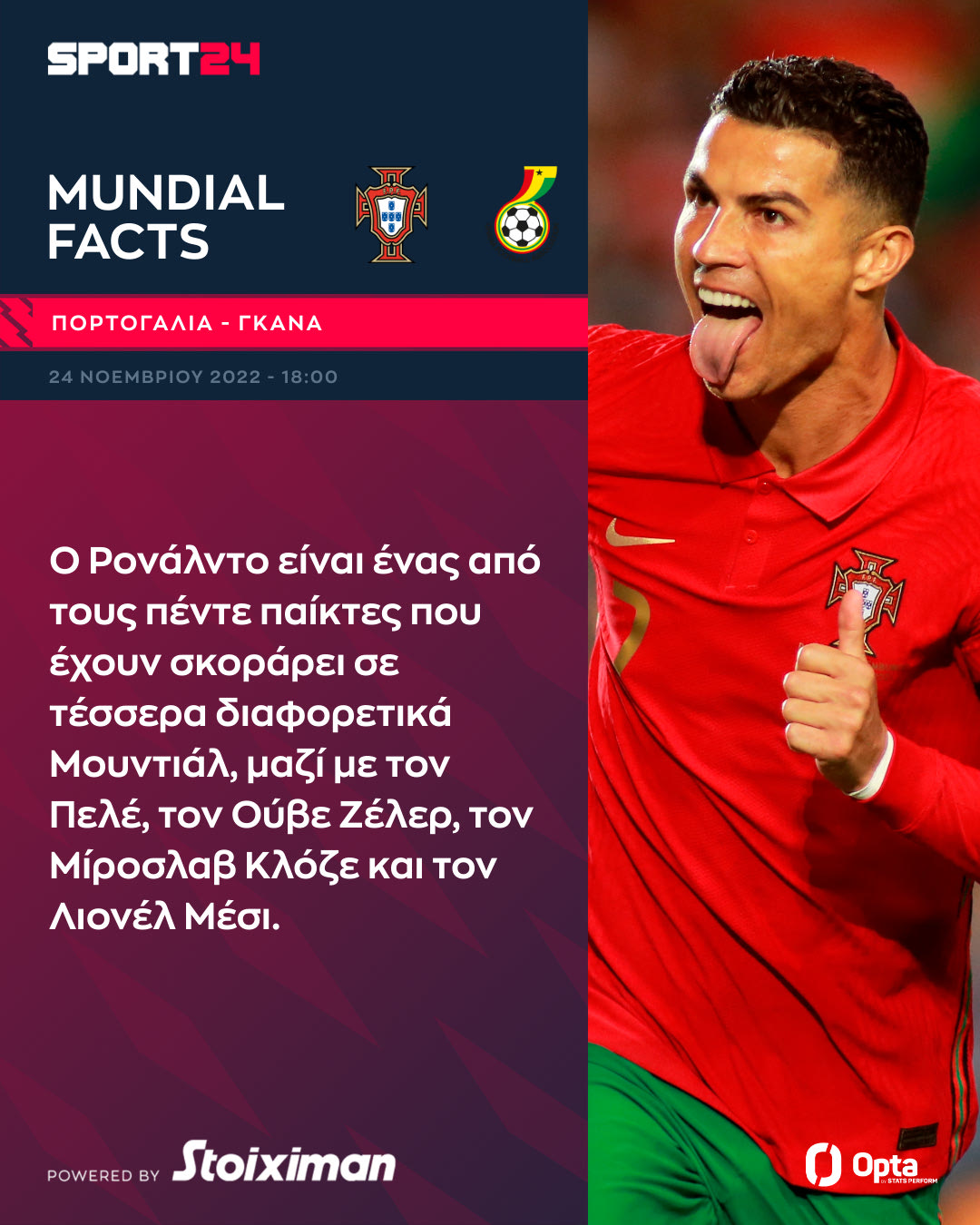 Η Πορτογαλία αντιμετωπίζει την Γκάνα για την πρώτη αγωνιστική του ογδόου ομίλου του Παγκοσμίου Κυπέλλου, με τα φώτα να είναι πάνω στον Κριστιάνο Ρονάλντο. Δείτε χρήσιμα facts για την αναμέτρηση.