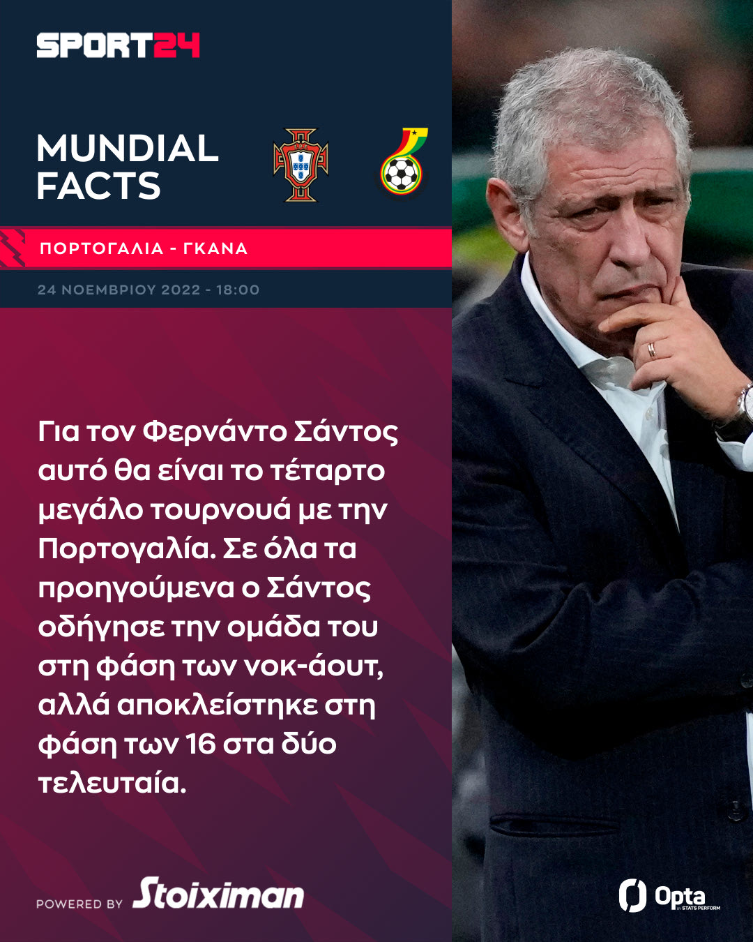 Η Πορτογαλία κάνει ποδαρικό στο Παγκόσμιο Κύπελλο του Κατάρ. Η ομάδα του Κριστιάνο Ρονάλντο και του Φερνάντο Σάντος αντιμετωπίζει την Γκάνα (24/11, 18:00, ΑΝΤ1/ΑΝΤ1+, LIVE SPORT24) για την πρώτη αγωνιστική του ογδόου ομίλου.