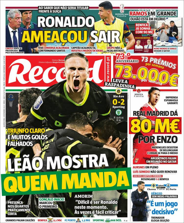 Το πρωτοσέλιδο της Record (08/12/22)
